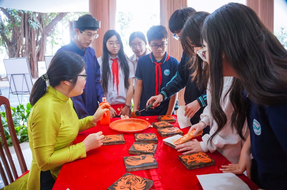Điểm nhấn của chương trình là hoạt động trải nghiệm in mộc bản. Dưới sự hướng dẫn của cán bộ chuyên môn, học sinh được trực tiếp thực hành kỹ thuật in trên giấy dó và tự tay tạo nên những sản phẩm mang dấu ấn riêng. Hoạt động đã thu hút sự tham gia hào hứng của các em.