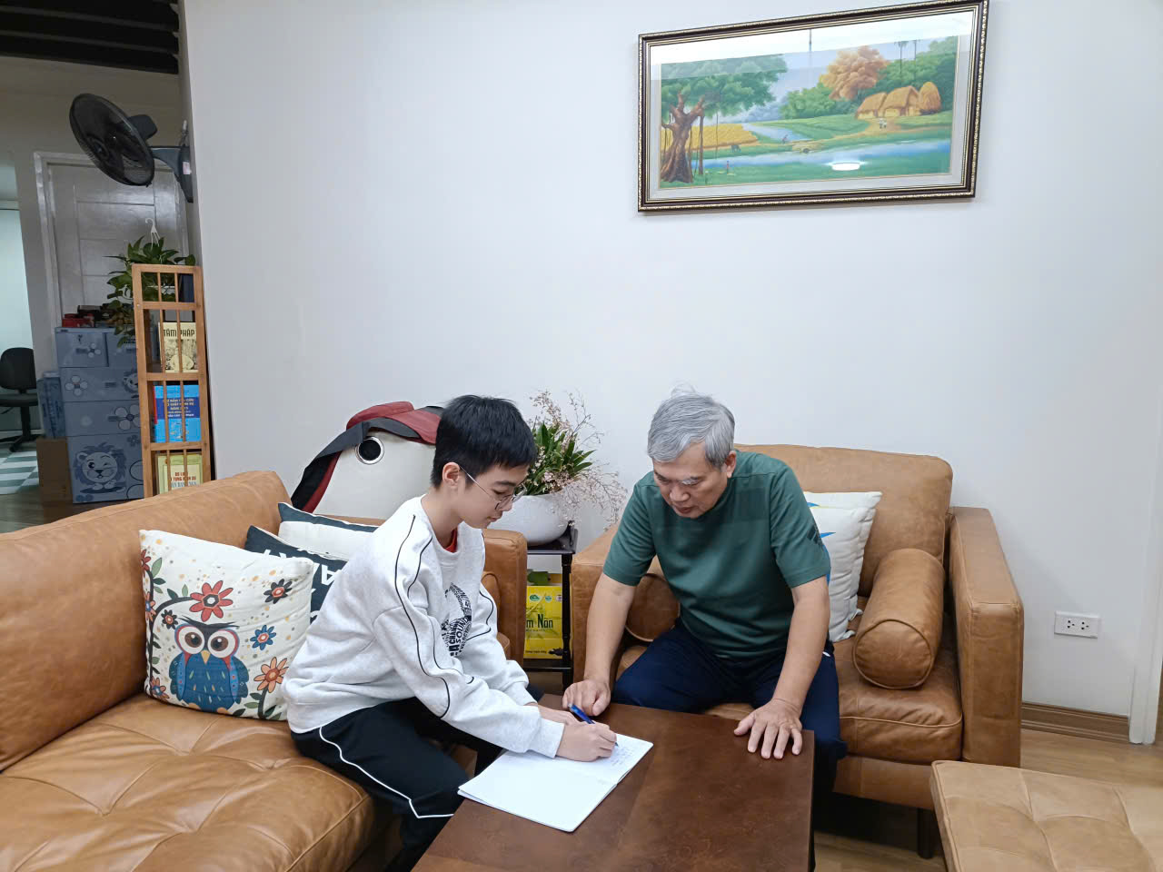 An Thành (6A2) cùng ông trao đổi, chuẩn bị nội dung cho bài phỏng vấn trong dự án “Âm vang một thời hoa lửa”.