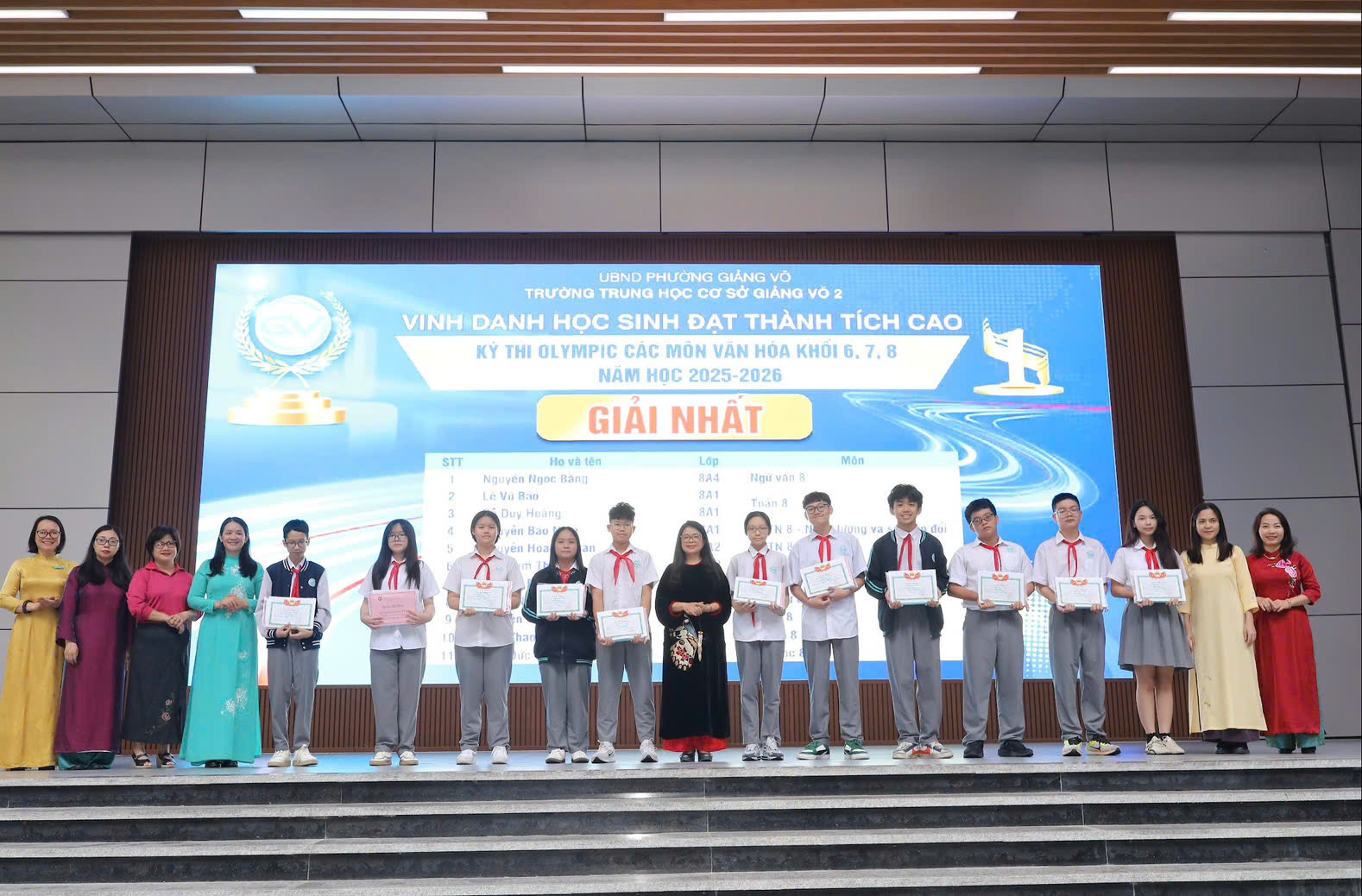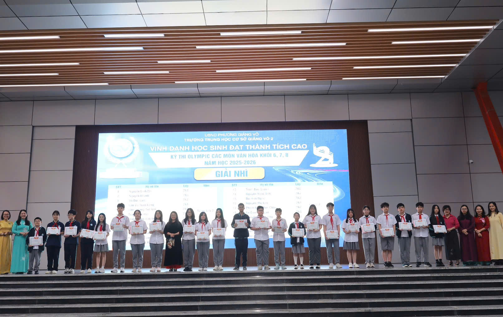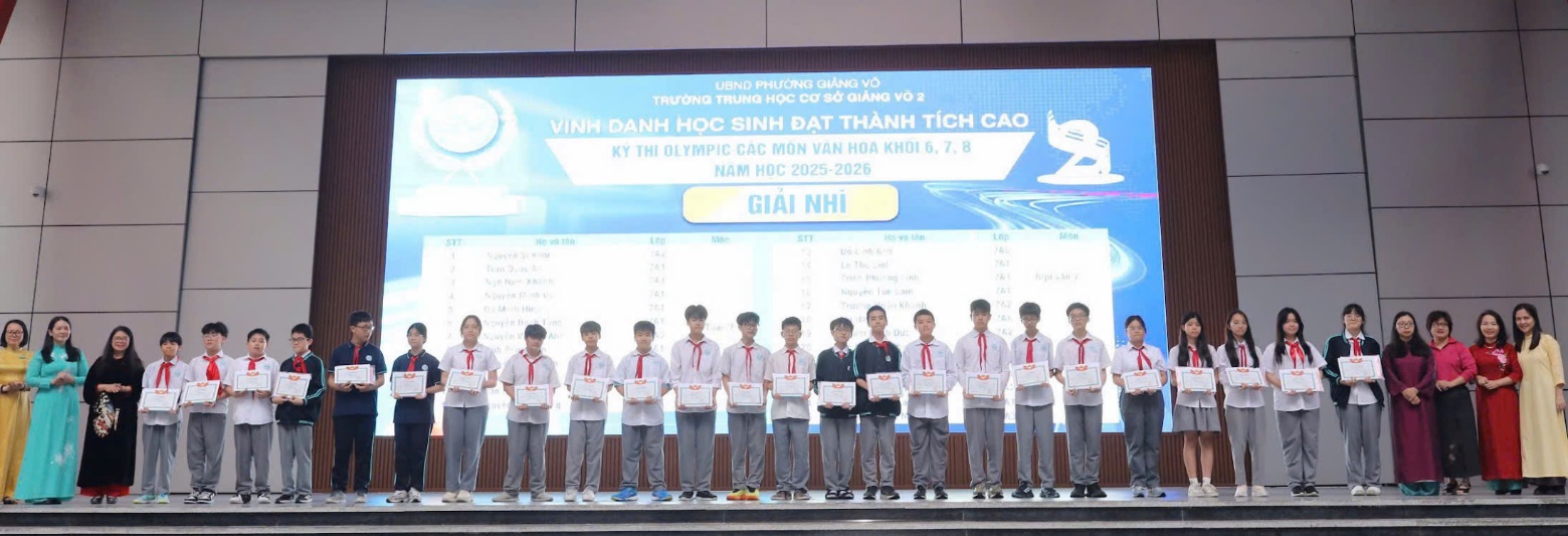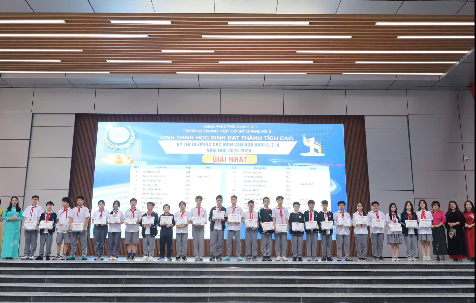 Từ ngày 27/2/2026, kỳ thi Olympic các môn văn hóa của trường THCS Giảng Võ 2 đã diễn ra, thu hút nhiều học sinh thử sức, đo tài. Và đến ngày 3/9/2026, trong buổi sinh hoạt dưới cờ, nhà trường đã tổ chức trao giải cho các học sinh đạt giải Nhất và Nhì cùng các học sinh đạt kết quả trong các cuộc thi quốc tế.
