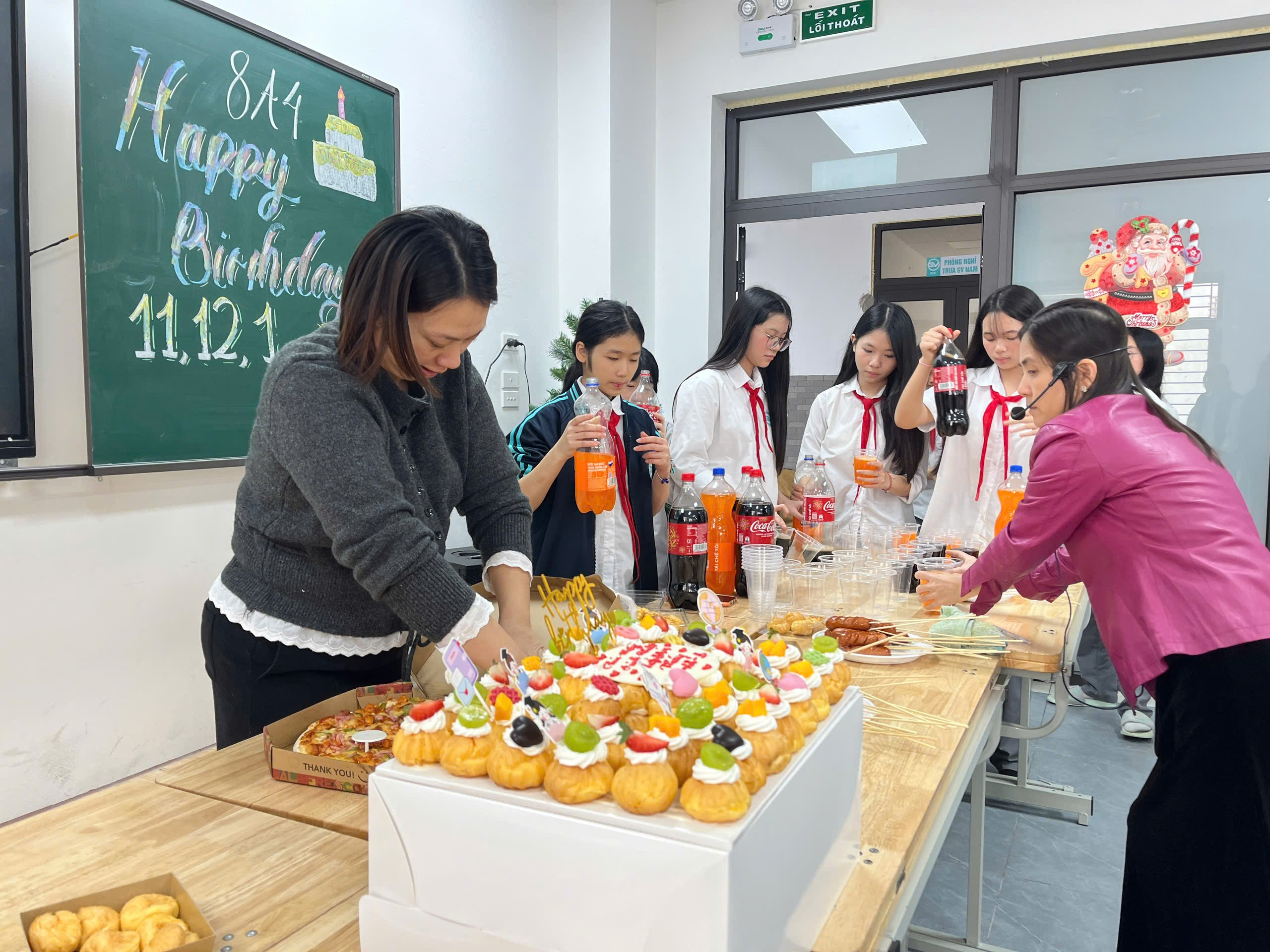 Để có được một buổi sơ kết trọn vẹn và ý nghĩa, các bạn học sinh lớp 8A4 đã cùng nhau chung tay chuẩn bị, từ những việc nhỏ nhất. Bạn quét dọn lớp học, bạn kê lại bàn ghế ngay ngắn, bạn tỉ mỉ trang trí bảng lớp, vẽ nên những hình ảnh đầy màu sắc. Bên cạnh đó, các bác phụ huynh cùng cô giáo chủ nhiệm cũng hỗ trợ bày biện bàn tiệc, chuẩn bị mọi thứ chu đáo. Không khí lớp học lúc ấy trở nên vô cùng ấm áp, rộn ràng tiếng cười nói, xóa nhòa mọi khoảng cách. Chỉ trong chốc lát, lớp học quen thuộc hằng ngày như khoác lên mình một “chiếc áo mới” – rực rỡ hơn, gần gũi hơn, đong đầy tinh thần tập thể.
