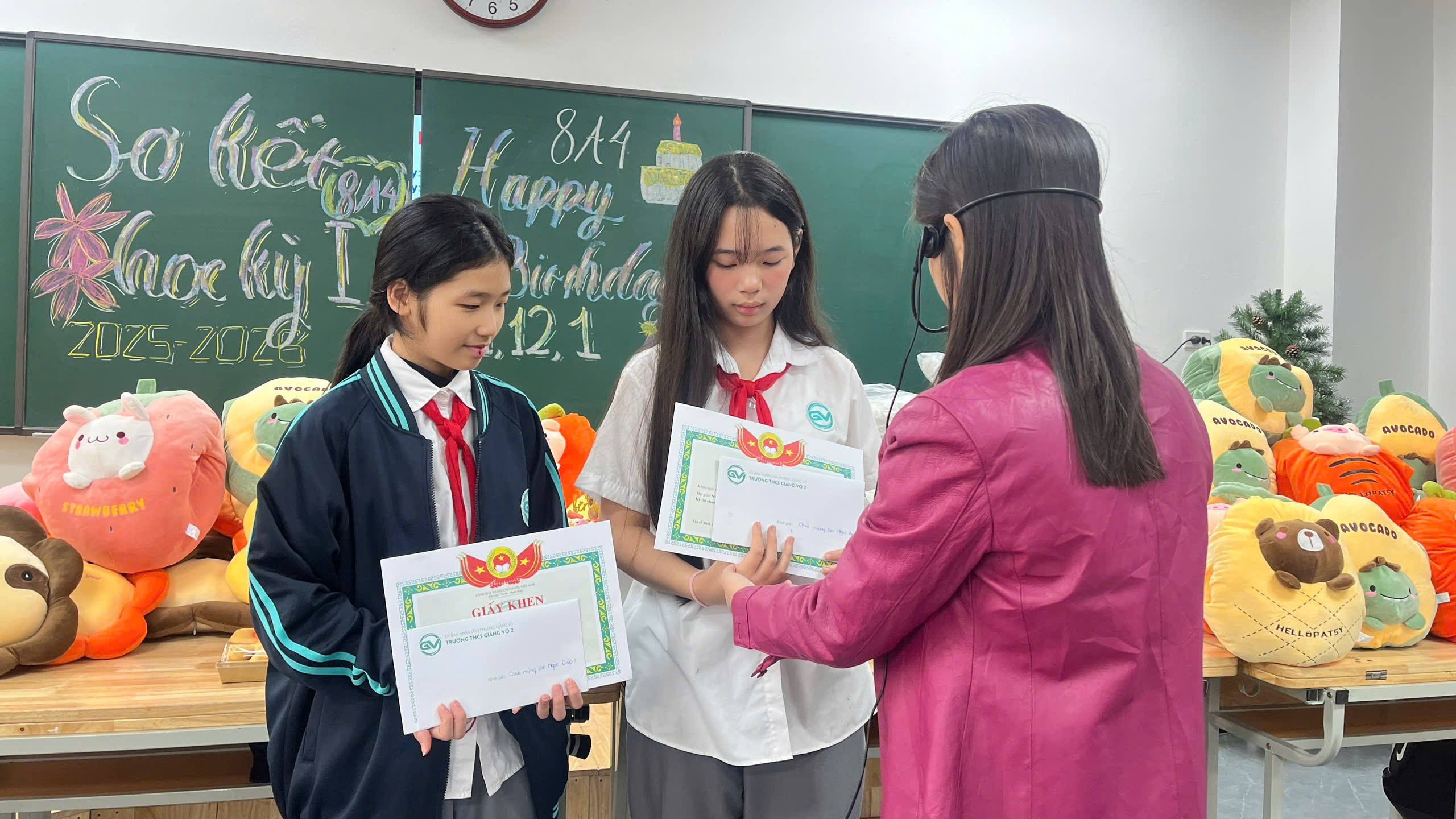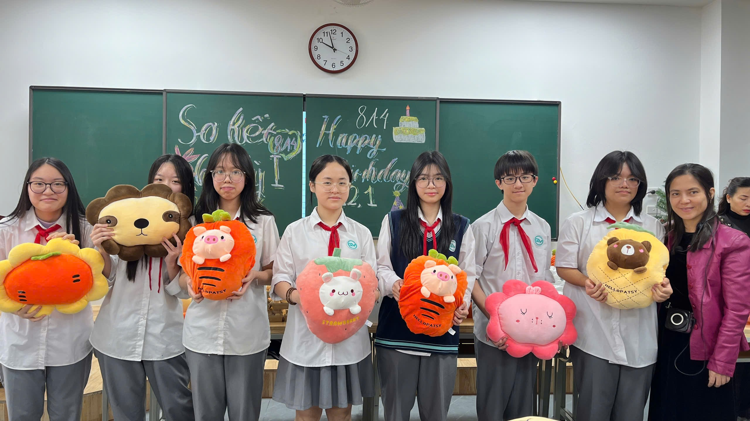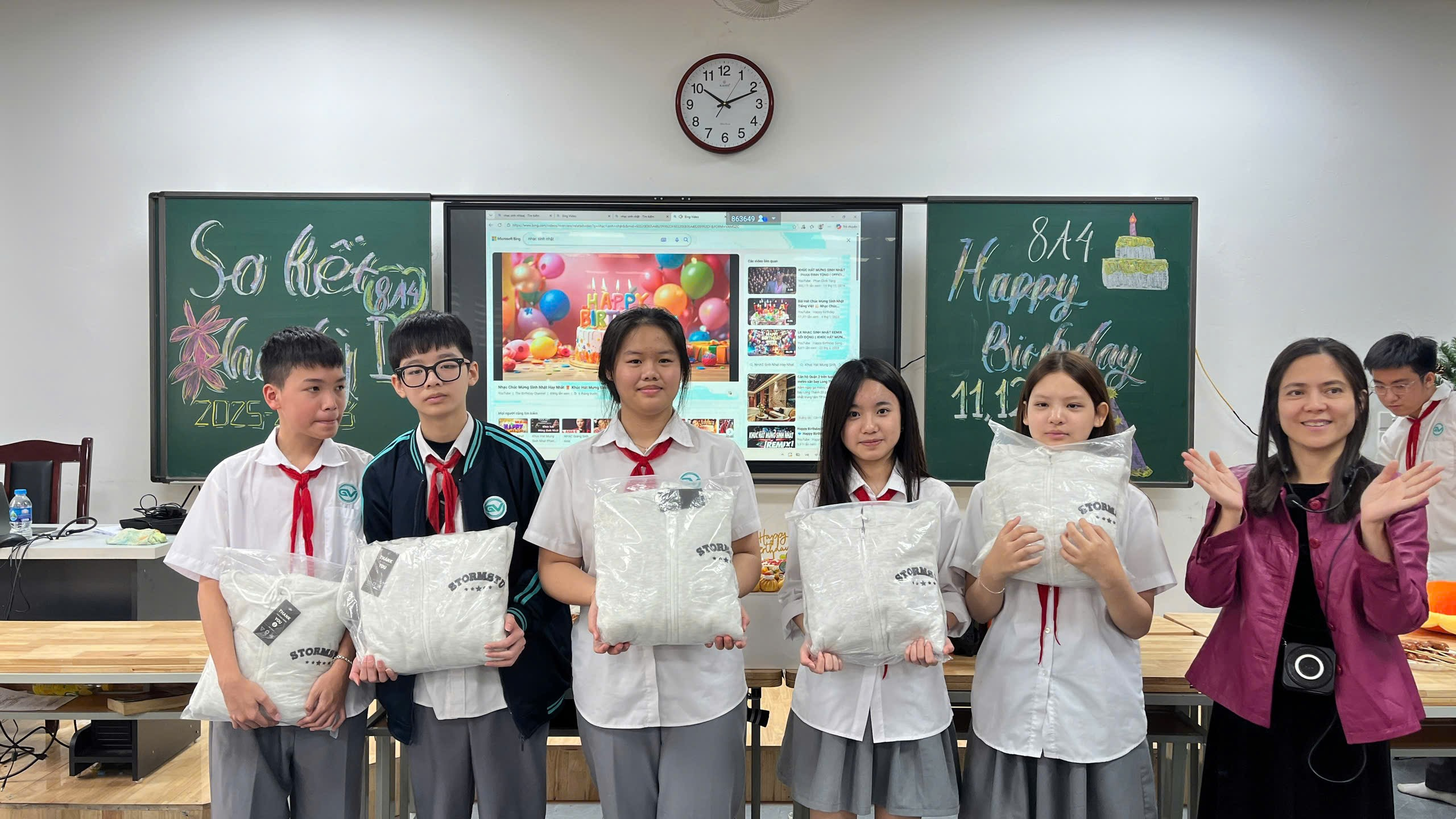 Không khí buổi sơ kết càng trở nên sôi nổi và ấm áp hơn khi lớp cùng nhau tổ chức sinh nhật cho các bạn có ngày sinh trong các tháng 11, 12 và tháng 1. Cả lớp cùng hòa chung giai điệu bài hát chúc mừng sinh nhật quen thuộc, gửi tới nhau những lời chúc ý nghĩa và tràn đầy yêu thương. Những nụ cười rạng rỡ, những ánh mắt hạnh phúc đã làm cho khoảnh khắc ấy trở nên thật đáng nhớ. Tiếp đó, ban phụ huynh lớp đã dành tặng cho các bạn những chiếc áo hoodie – món quà tuy giản dị nhưng chứa đựng sự quan tâm, yêu thương và kỳ vọng mà các bác phụ huynh gửi gắm tới tập thể lớp 8A4.