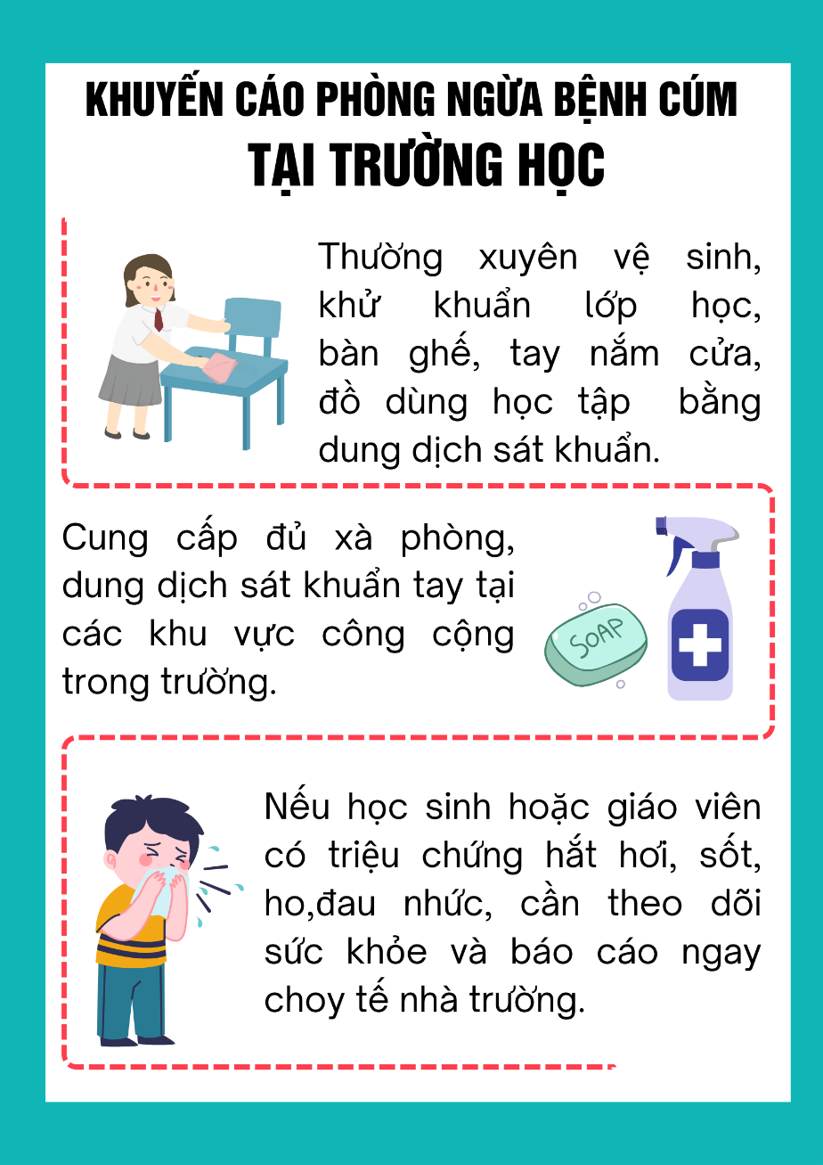 Phòng chống bệnh cúm mùa là trách nhiệm của mỗi người vì sức khỏe bản thân, gia đình và cộng đồng. Nhà trường rất mong sự phối hợp chặt chẽ của quý phụ huynh để bảo vệ sức khỏe cho các em học sinh.