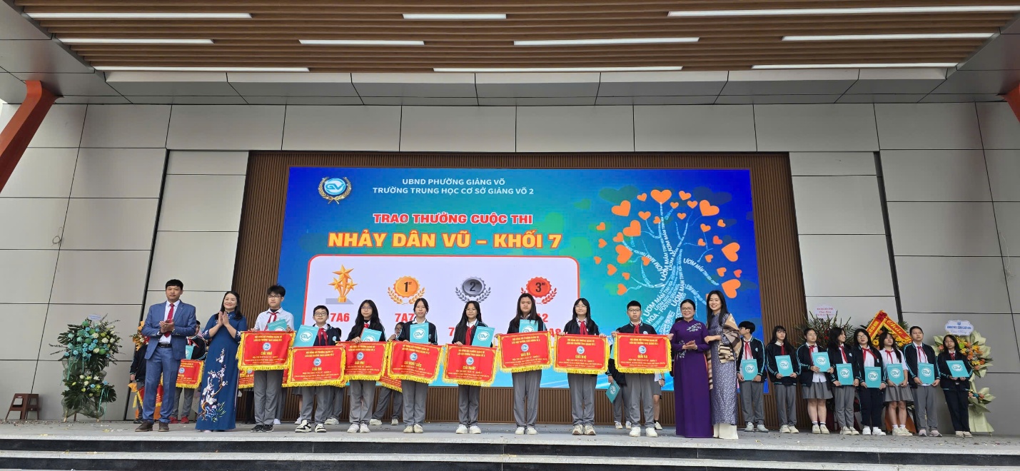 Các bạn học sinh khối 7 đại diện lớp lên nhận giải nhảy dân vũ