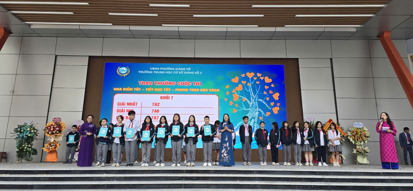 Kết thúc tiết mục văn nghệ đầy xúc động của tập thể lớp 6A9 là lúc đại diện HS, PHHS lên trao tận tay Ban Giám Hiệu nhà trường những bó hoa tươi thắm và gửi lời chúc trân thành nhất đến các thầy cô giáo trong trường. Nhà trường cũng đã tổng kết đợt thi đua chào đón ngày 20-11 của trường Giảng Võ 2 và công bố trước toàn trường giải của các cuộc thi Flashmob, giới thiệu sách, Hoa điểm tốt…