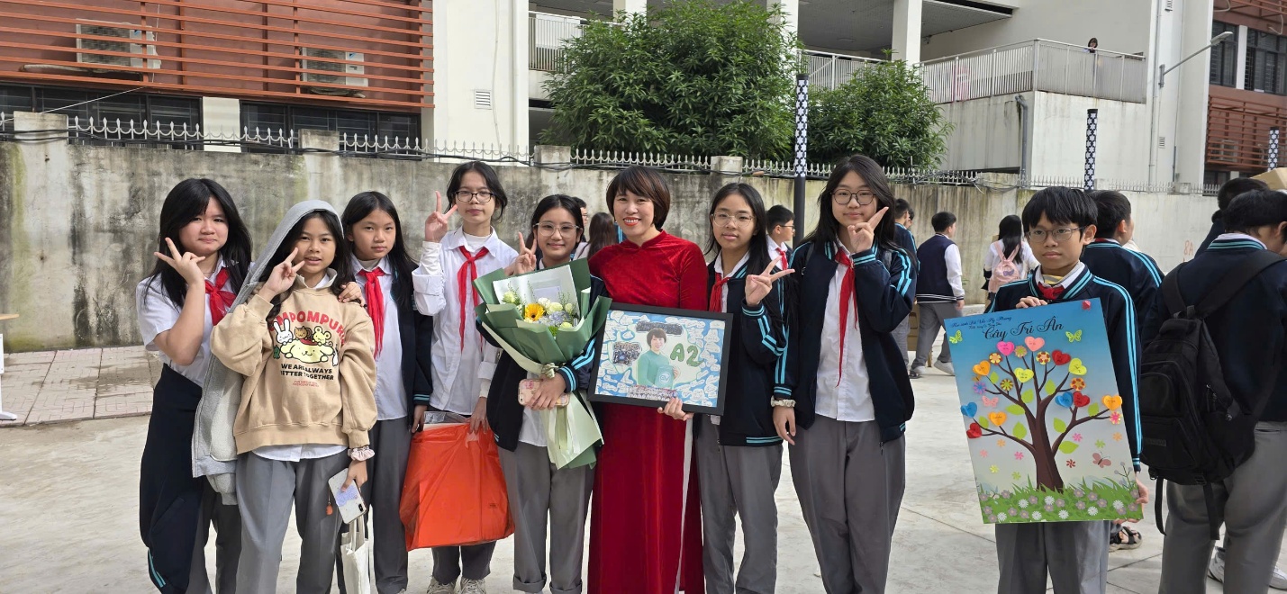 Cùng hòa vào niềm vui của trường, tập thể lớp 7A2 chúng tớ đã có một bất ngờ nho nhỏ dành cho cô giáo chủ nhiệm Tôn Thị Thúy Diệu. Từ 2 tuần trước ngày 20-11, chúng tớ đã cùng nhau góp tiền vào quỹ lớp riêng của học sinh, mỗi bạn đều góp một phần, bạn đóng nhiều bù cho bạn đóng ít, cùng nhau mua tặng cô một hộp hoa nhỏ xinh xắn để cô đặt ở bàn làm việc. Ngoài ra, bọn tớ đã trích ra một ít tiền nhỏ trong quỹ để mua đồ dùng về làm cho cô một bức tranh gồm đầy đủ tất cả chữ kí của các bạn trong lớp và hình ảnh cô trong bộ áo dài màu xanh ngọc của trường THCS Giảng Võ 2.