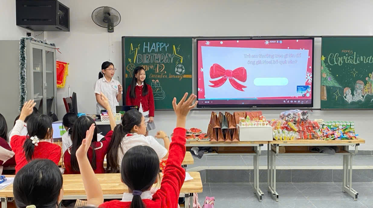 Vào đúng ngày lễ 25/12, cả lớp tưng bừng lễ hội. Các bạn mặc những bộ quần áo màu đỏ và trắng, đeo phụ kiện Giáng sinh và đội mũ đỏ. Ngoài ra, mọi người ai cũng mang theo những món quà tặng được bọc và đựng trong giấy gói in hình màu sắc sặc sỡ để tặng cho những người bạn thân. Vừa đến giờ ra chơi, các bạn đã trang trí bảng với các hình vẽ người tuyết, cây thông và quà Giáng sinh. Không chỉ thế, các bác và các cô trong bạn phụ huynh cũng mang đến rất nhiều món bánh kẹo, trái cây ngon miệng và cùng các bạn học sinh bày biện ra bàn.