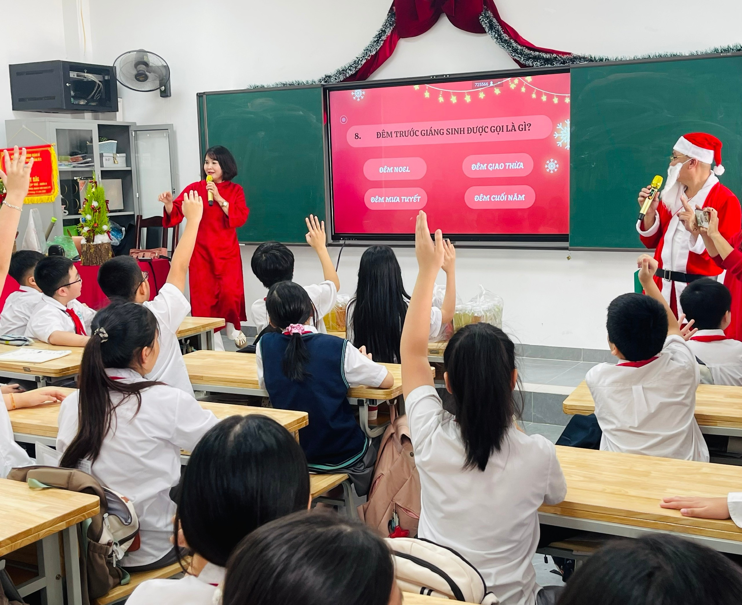 Không khí lớp học càng lúc càng trở nên “nóng” hơn khi buổi tiệc chính thức bắt đầu. Sự xuất hiện của ông già Noel bên cạnh cô giáo chủ nhiệm Nguyễn Thị Phương ngay từ những phút đầu tiên đã đã khiến cả lớp vỡ òa phấn khích. Trong vai trò chủ trì, cô giáo và ông già Noel đã phối hợp vô cùng nhịp nhàng, dẫn dắt chúng em ngược dòng thời gian để tìm hiểu về ý nghĩa ngày lễ Noel. Qua những câu hỏi đố vui hóc búa nhưng không kém phần thú vị, chúng em không chỉ có thêm kiến thức bổ ích mà còn có những tràng cười sảng khoái. Những cánh tay giờ cao đầy hào hứng, những câu trả lời thông minh hòa cùng tiếng vỗ tay rộn rã đã tạo nên một khoảnh khắc gắn kết khó quên.