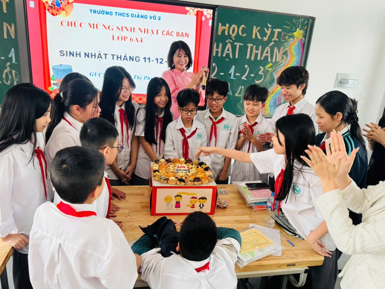 Sau phần lễ trang trọng, không khí lớp học bỗng chốc trở nên sôi động với bữa tiệc sinh nhật tập thể dành cho các bạn sinh có ngày sinh trong tháng 11, 12, 1, 2 và 3. Trong ánh nến lung linh và giai điệu “Happy Birthday” vang lên rộn rã, chúng em đã cùng nhau cầu nguyện những điều tốt đẹp nhất cho tuổi mới. Những món quà nhỏ, những cái ôm ấm áp cùng lời chúc từ cô Phượng và các bác phụ huynh đã khiến các “nhân vật chính” không khỏi xúc động. Khoảnh khắc ấy, dường như mọi khoảng cách đều xóa nhòa, chỉ còn lại tình bạn, tình thân gắn bó của đại gia đình 6A4.