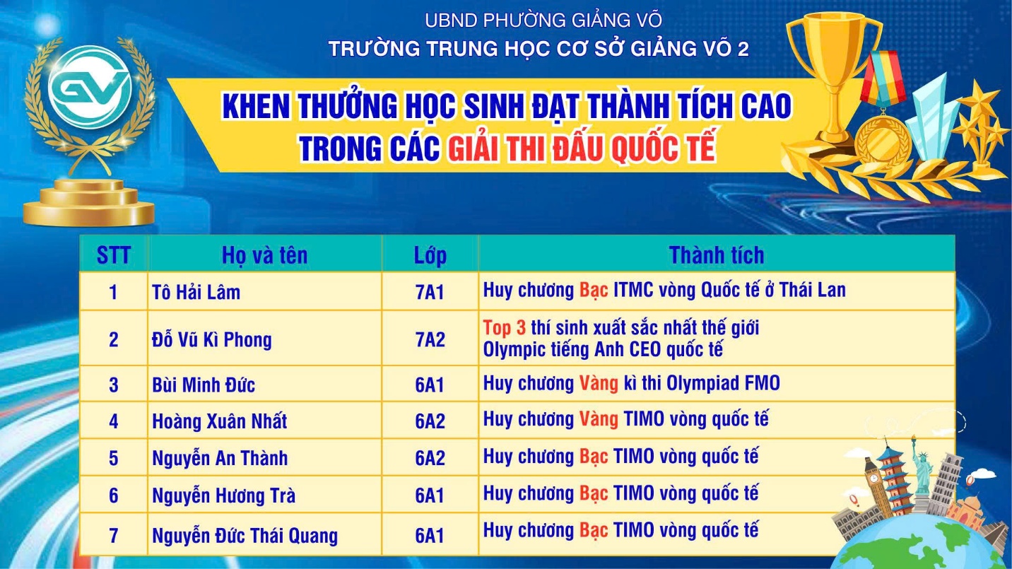 Thành tích của các em không chỉ là kết quả của quá trình học tập nghiêm túc và nỗ lực bền bỉ mà còn góp phần lan tỏa niềm tự hào trong cộng đồng giáo viên, học sinh Trường THCS Giảng Võ 2. Đây cũng là minh chứng cho môi trường học tập tích cực, nơi học sinh được khuyến khích phát huy năng lực, tự tin tham gia và tỏa sáng tại các sân chơi học thuật trong nước và quốc tế.