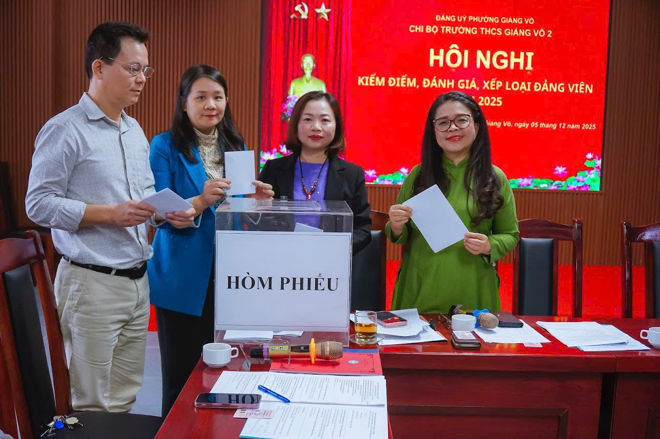 Trên cơ sở thảo luận dân chủ, công khai và thống nhất trong Chi bộ, hội nghị đã tiến hành bỏ phiếu và đề xuất xếp loại năm 2025. Chi bộ THCS Giảng Võ 2 được đề xuất Hoàn thành xuất sắc nhiệm vụ; đồng thời, đối với đảng viên, Chi bộ đề xuất 07 đồng chí Hoàn thành xuất sắc nhiệm vụ và 37 đồng chí Hoàn thành tốt nhiệm vụ. Những kết quả này phản ánh tinh thần trách nhiệm, sự nghiêm túc và nỗ lực đoàn kết của toàn Chi bộ trong suốt năm qua.