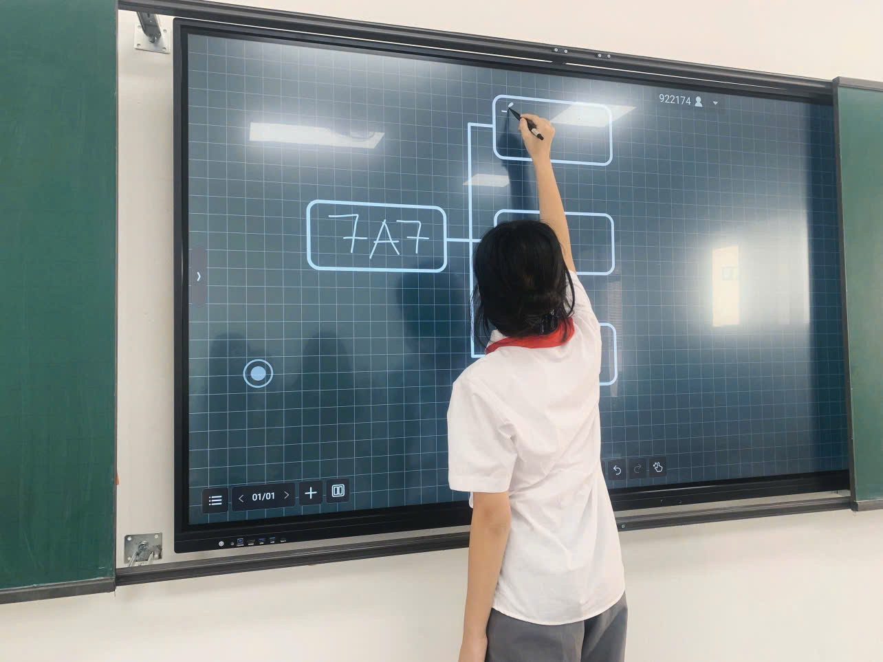Bạn lớp trưởng đang học cách sử dụng màn hình tương tác