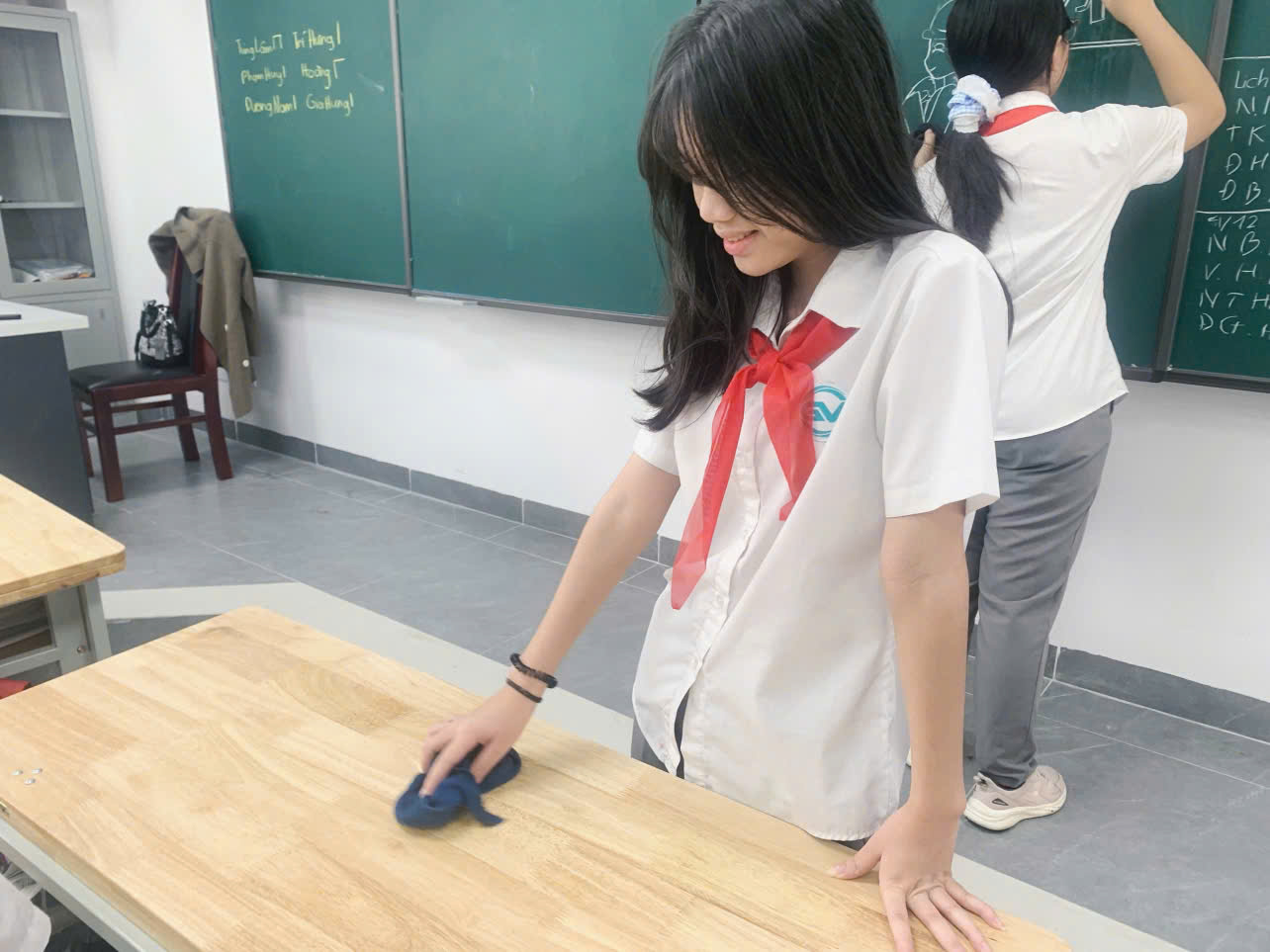 Cùng lau bàn ghế lớp để giữ cho lớp học luôn sạch, đẹp
