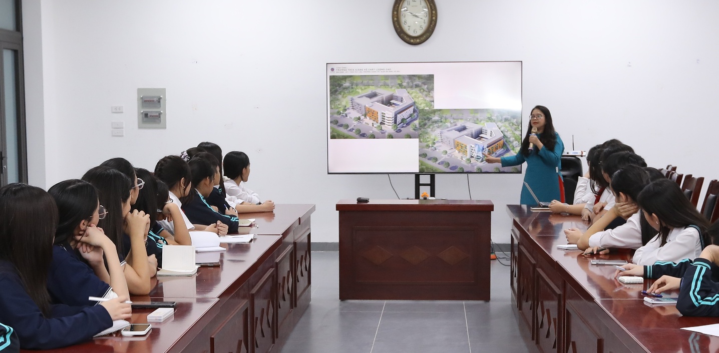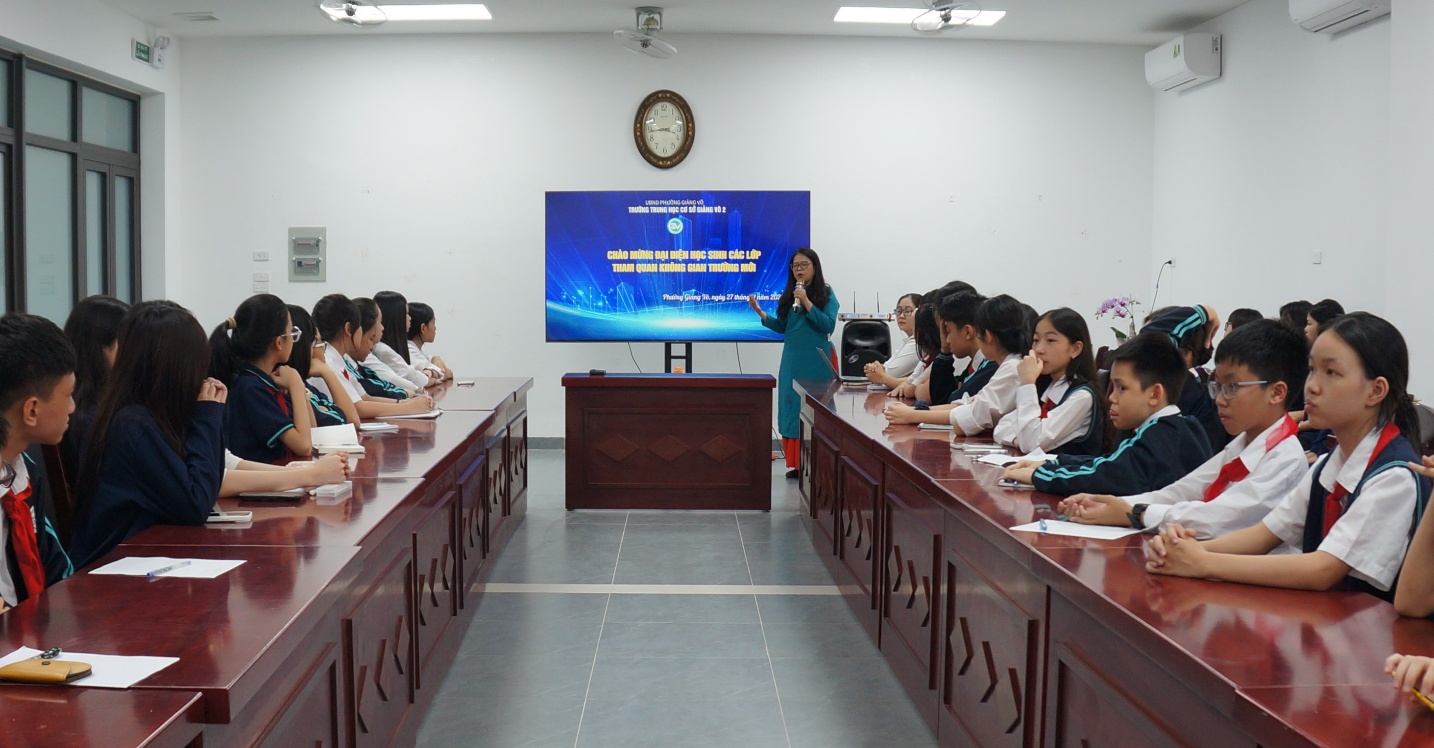 Trước khi tham quan, chúng em được nghe cô giáo Phạm Thị Hương Giang - Hiệu trưởng nhà trường giới thiệu về tổng thể diện mạo mới của trường. Ngôi trường được xây dựng trên khuôn viên rộng 5.600 m², mang phong cách hiện đại, thân thiện và ngập tràn màu xanh, đặc biệt là hàng hoa sưa – loài cây sẽ trở thành dấu ấn của Giảng Võ 2.