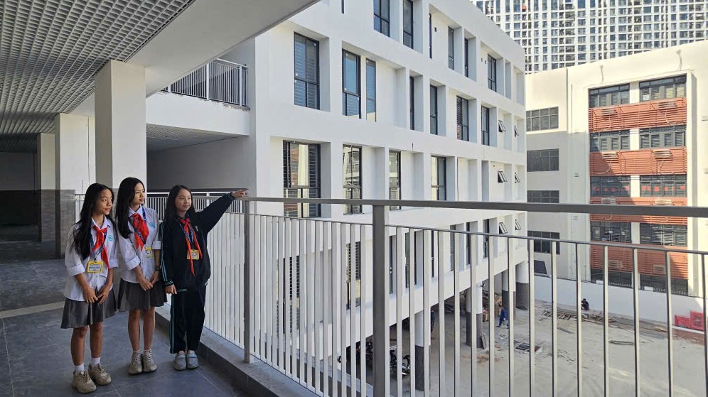 Cô Hiệu trưởng mô tả các khối nhà được bố trí hài hòa và mở tầm nhìn về phía hồ Giảng Võ, tạo không gian học tập thoáng sáng và trong lành. Hệ thống phòng học được thiết kế theo tiêu chuẩn phòng học thông minh, thư viện mở nhiều ánh sáng, nhà đa năng hiện đại, cùng tầng 1 là không gian mở với phù điêu sách và khu sinh hoạt chung – tất cả đều mang lại cảm giác vừa trang trọng vừa gần gũi.