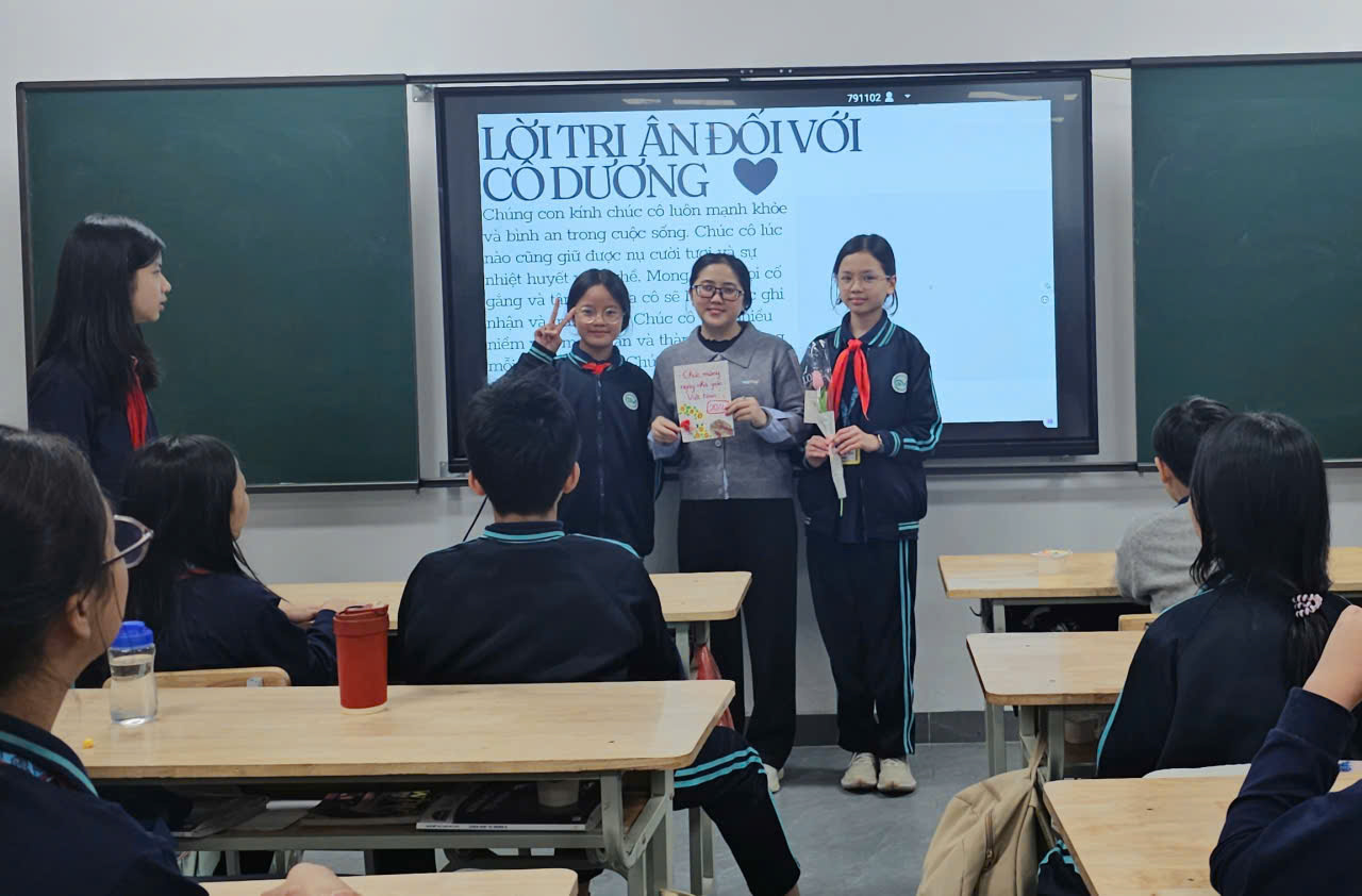 Cô Dương nhận hoa và thiệp chúc mừng 20/11 từ học sinh lớp 6A2 trong buổi tri ân ấm áp.