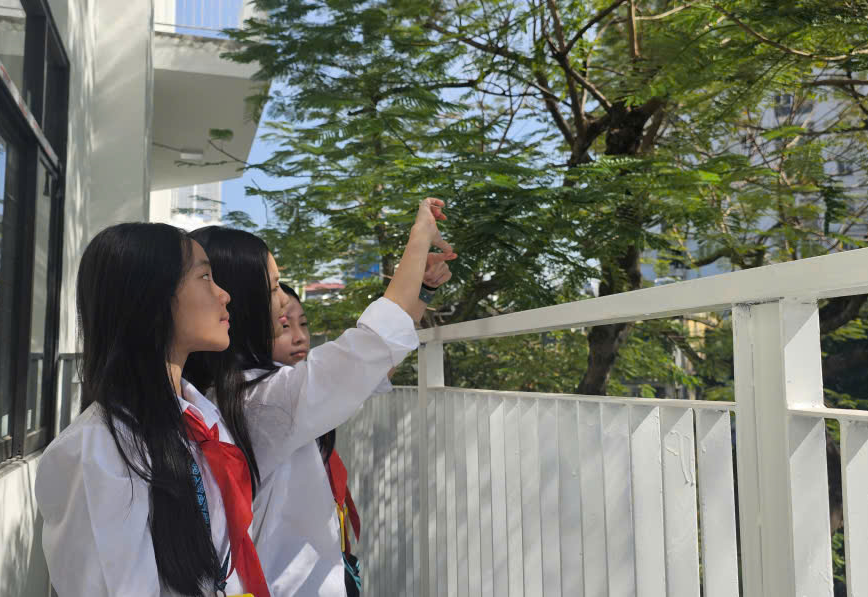 Điều khiến chúng em thích thú nhất là phòng học có hai ban công: một ban công hướng ra sân trường xanh mát, ban công còn lại nhìn về phía khách sạn Hanoi – nơi có một cành phượng vươn sang ngay trước lớp. Chắc chắn khi mùa hè đến, cành phượng ấy sẽ trở thành góc “check-in” rất đẹp của 6A2.