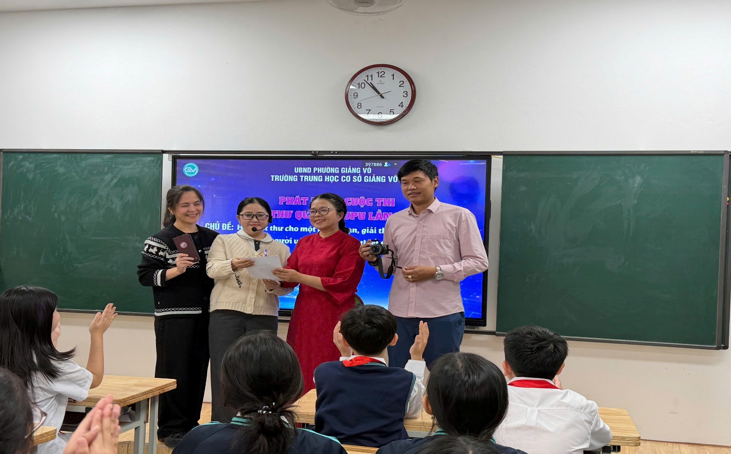 Học sinh đại diện các lớp hào hứng trong buổi phát động cuộc thi viết thư UPU của nhà trường.