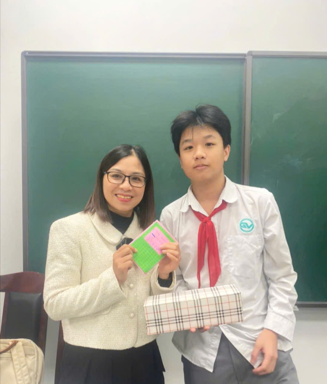 Bạn Chí Dũng đại diện lớp tặng chiếc thiệp xinh xắn và một món quà ý nghĩa dành tặng cô Thu Hiền – giáo viên đảm nhận dạy môn KHTN – Sinh của lớp 9A4