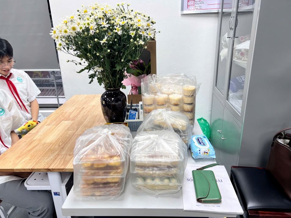 Sau đó, các bạn học sinh đã cùng cô giáo liên hoan với một số món đồ ăn nhẹ như là caramel và những chiếc bánh ngọt nhỏ xinh. Cả lớp cùng nhau thưởng thức, trò chuyện rộn rã, tiếng cười vang lên xen lẫn mùi thơm hấp dẫn của các món ăn. Buổi liên hoan không chỉ giúp mọi người thư giãn sau những tiết học căng thẳng mà còn gắn kết tình cảm thầy trò thêm bền chặt, để lại dư âm ấm áp và hạnh phúc trong lòng tất cả mọi người.