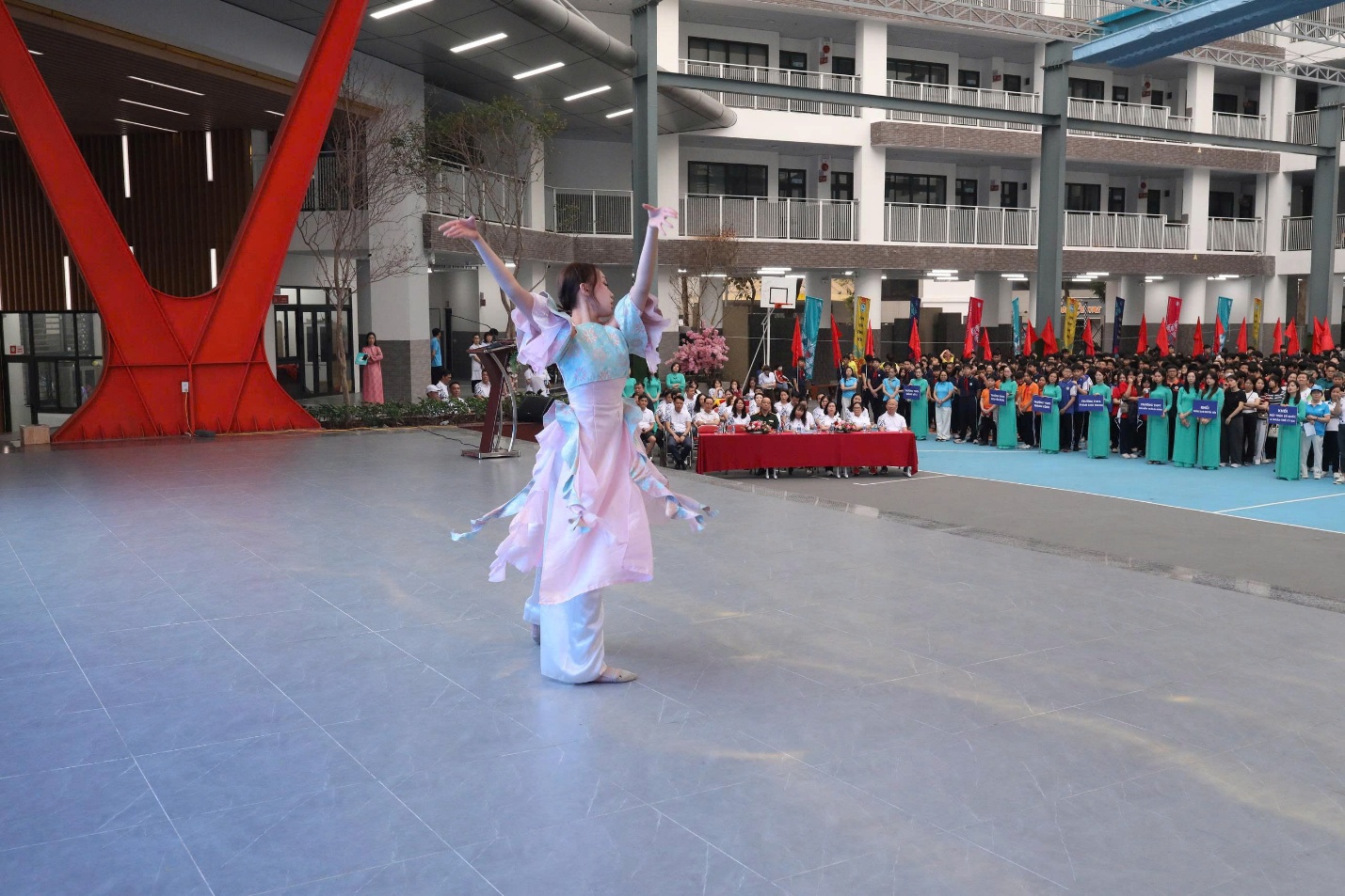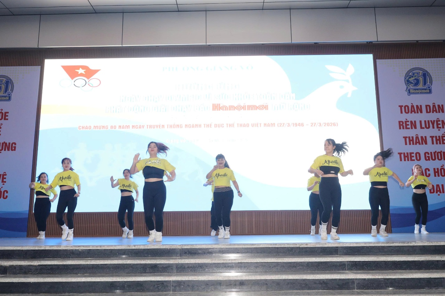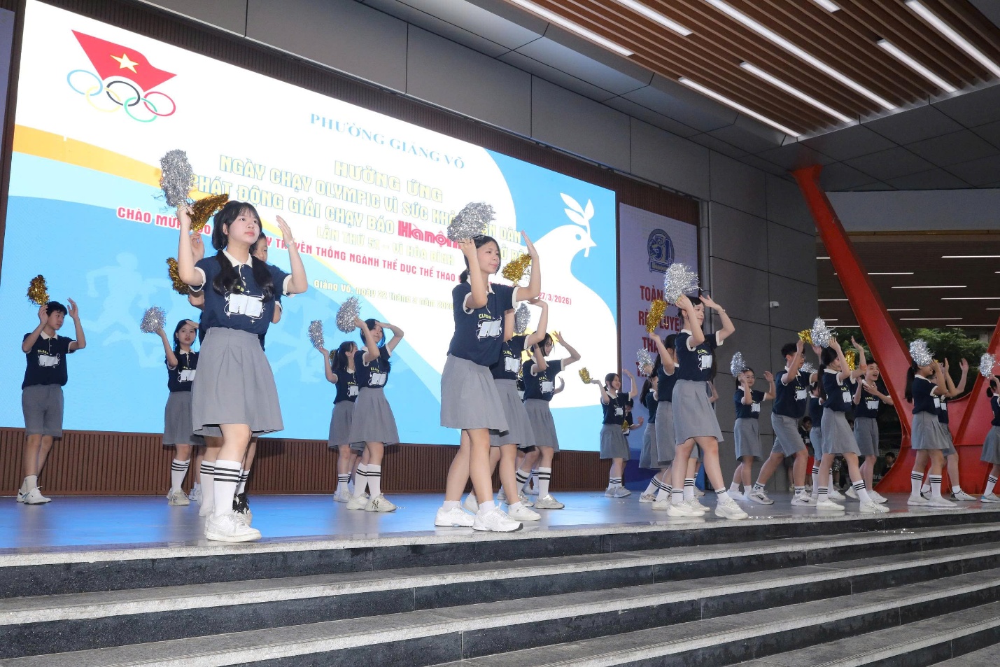 Không khí chương trình diễn ra trang trọng, sôi nổi với nhiều nội dung phong phú. Mở đầu là chuỗi tiết mục đặc sắc: nhảy Zumba sôi động của Trung tâm Văn hóa – Thông tin và Thể thao phường Giảng Võ; thể dục nghệ thuật do học sinh Phương Linh – lớp 9A5 thực hiện, em là vận động viên đạt nhiều thành tích nổi bật với 3 Huy chương bạc (trong đó có 1 Huy chương bạc toàn năng) và 2 Huy chương đồng tại Giải quốc tế PP Cup Thái Lan 2025, cùng 1 Huy chương vàng, 2 Huy chương bạc và 2 Huy chương đồng tại Giải quốc gia 2025; cùng màn flashmob “Đi giữa trời rực rỡ” của học sinh lớp 7A6, Trường THCS Giảng Võ 2, tạo không khí hào hứng trước giờ xuất phát.