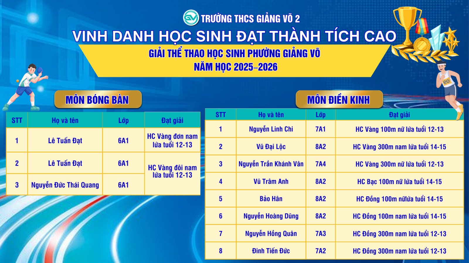 Xin chúc mừng các vận động viên! Tin tưởng rằng trong thời gian tới, phong trào thể dục thể thao của trường THCS Giảng Võ 2 sẽ tiếp tục phát triển và gặt hái nhiều thành công hơn nữa.