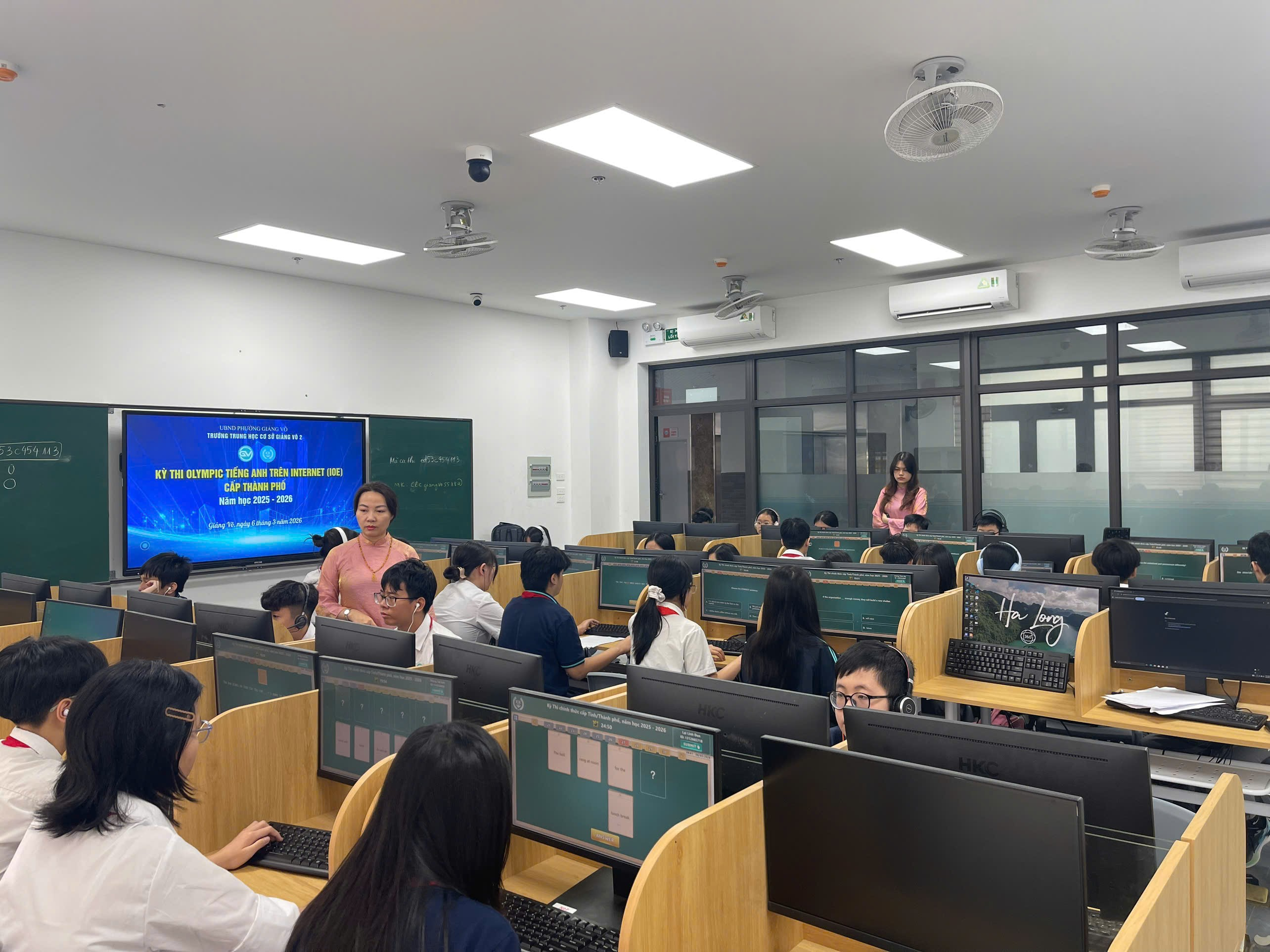 Không khí nghiêm túc nhưng đầy tự tin của học sinh THCS Giảng Võ 2 trong giờ thi IOE cấp Thành phố, dưới sự hỗ trợ kỹ thuật tận tình của các thầy cô.
