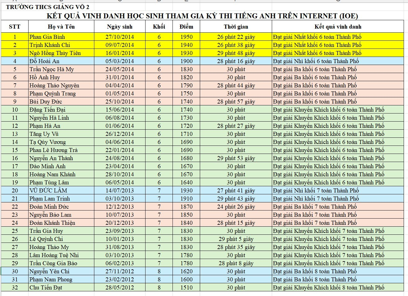 Kỳ thi IOE cấp Thành phố là sân chơi học thuật uy tín, thu hút đông đảo học sinh tham gia mỗi năm. Năm học này, học sinh trường THCS Giảng Võ 2 đạt tổng cộng 32 giải, gồm: 3 giải Nhất, 3 giải Nhì, 10 giải Ba và 16 giải Khuyến khích.