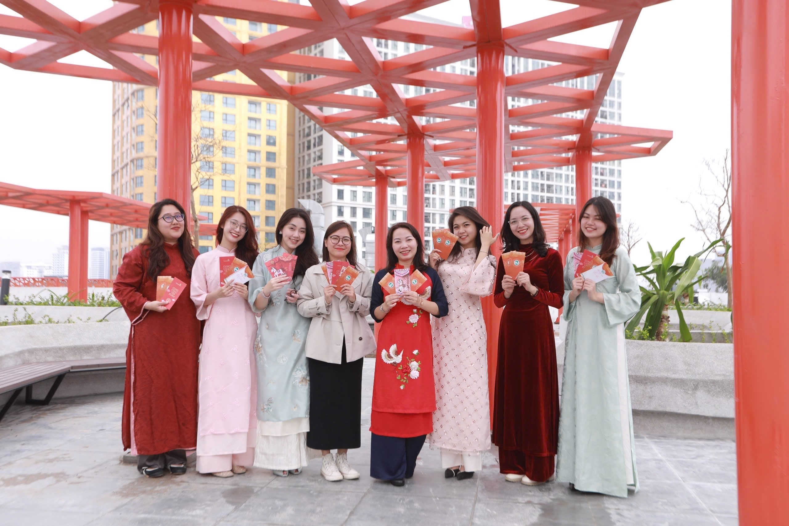 Cô giáo Nguyễn Ngọc Anh (áo dài đỏ đứng giữa) cùng Tổ Ngoại ngữ – lực lượng nòng cốt trong công tác bồi dưỡng học sinh đạt thành tích cao tại IOE.