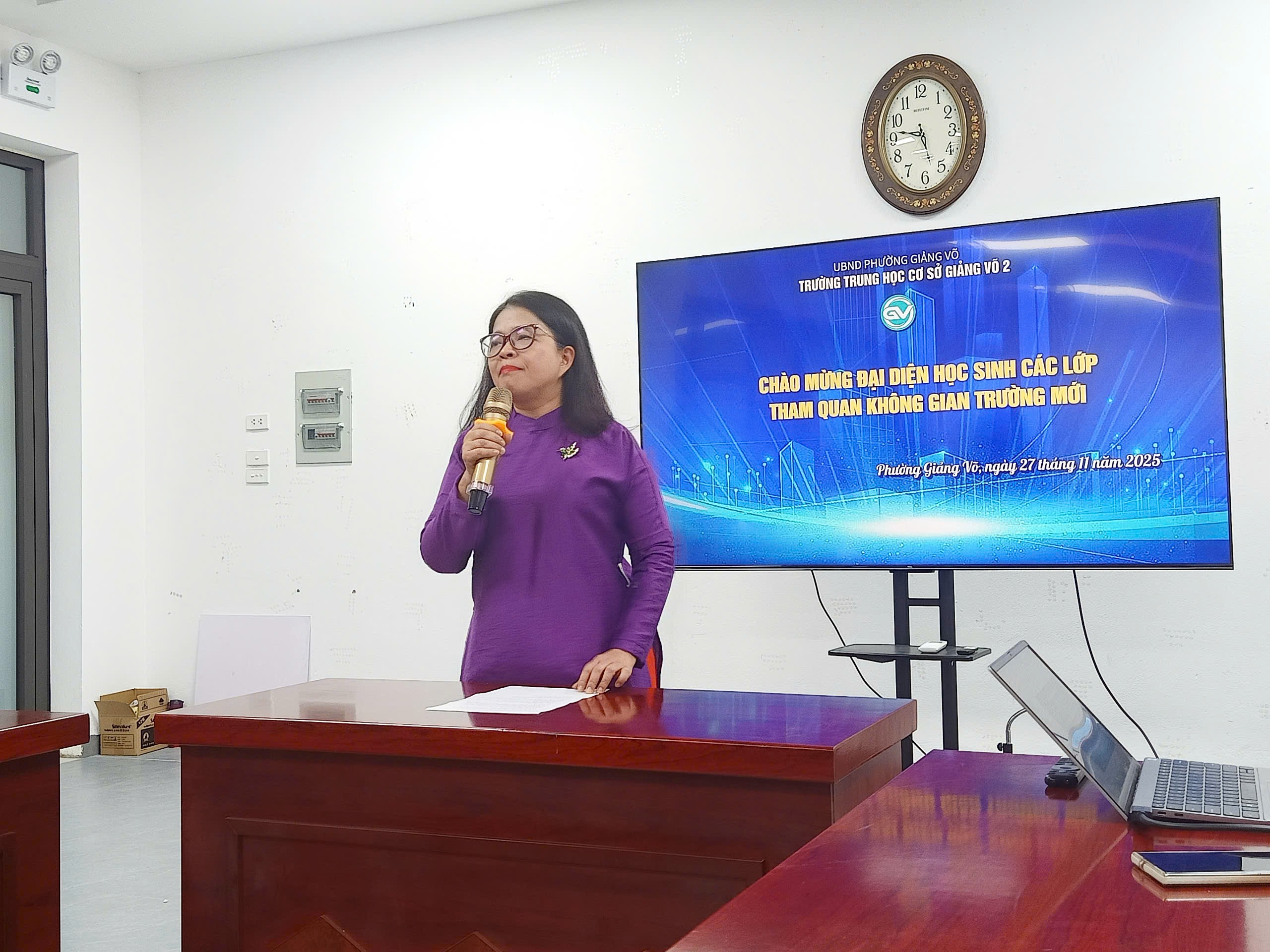 Cô hiệu trưởng Phạm Thị Hương Giang chào mừng các đại diện học sinh các lớp
