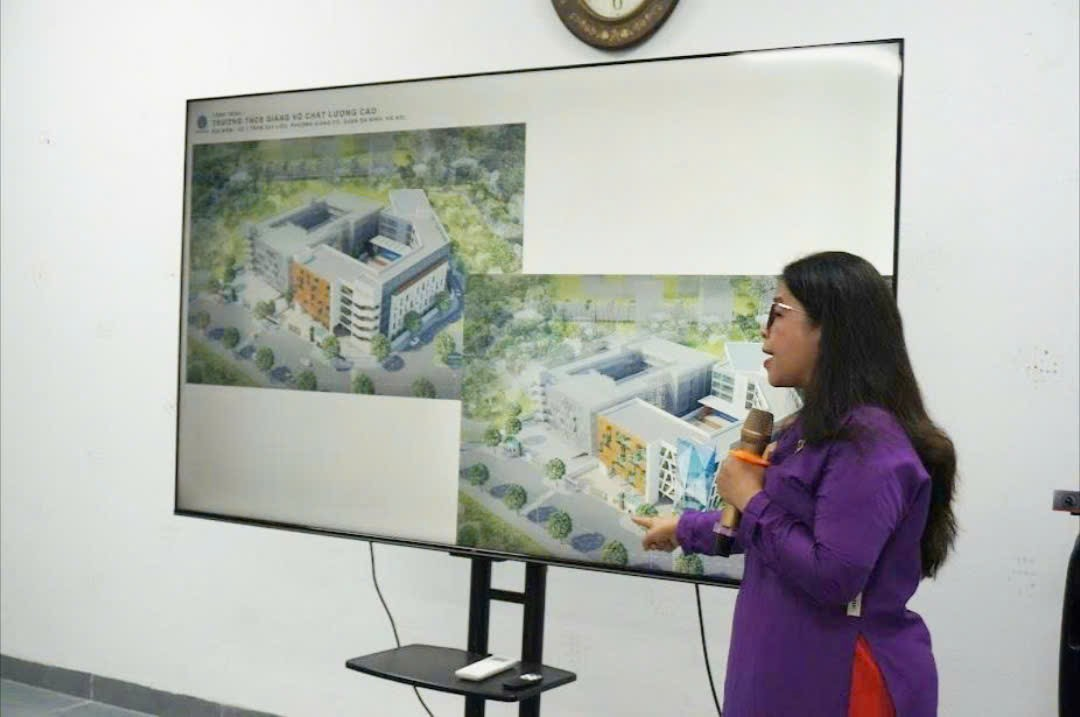 Trong phần giới thiệu mở đầu, đại diện Ban giám hiệu đã giới thiệu tổng quan về ngôi trường: khuôn viên rộng rãi, tone màu nhận diện hài hòa, logo và đồng phục mới mang tính trẻ trung. Các khối công trình như tòa nhà học chính, khối đa năng, thư viện, nhà ăn, sân thượng... đều được thiết kế theo phong cách hiện đại, thân thiện, với nhiều không gian xanh tạo cảm giác thoáng đãng và đầy cảm hứng. Một điểm nhấn đặc biệt là khối kim cương – biểu tượng cho định hướng chiến lược của nhà trường, mang ý nghĩa "Mài ngọc – Luyện kim cương”, khuyến khích mỗi học sinh không ngừng nỗ lực và bứt phá.