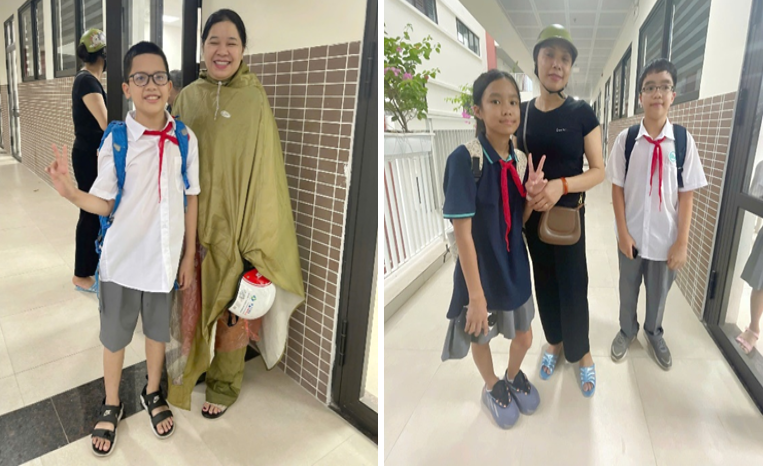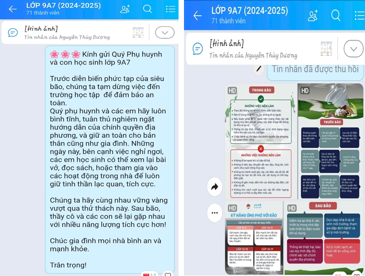 Ngay trong chiều ngày 6/9/2024, nhà trường đã thông báo cho phụ huynh về việc đón con em về sớm hơn dự kiến. Nhờ sự phối hợp chặt chẽ, các bậc phụ huynh đến trường đón học sinh về sớm trước khi bão đổ bộ. Một số thầy cô tận tình đã đưa học sinh về tận nhà, đặc biệt là những học sinh ở xa hoặc có khó khăn trong việc đi lại. Phụ huynh sau đó gửi tin nhắn cảm ơn và phản hồi khi các con đã về đến nhà an toàn, thể hiện niềm an tâm và biết ơn đối với sự quan tâm của nhà trường.