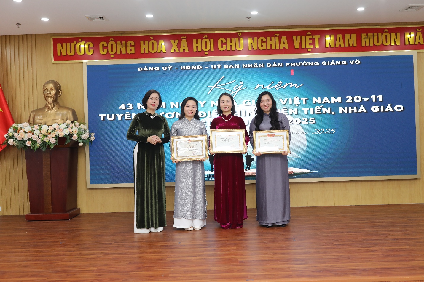 Phó Bí thư TT Đảng ủy phường Giảng Võ Nguyễn Quế Anh trao khen thưởng cho các nhà giáo – Trong đó có cô giáo Nguyễn Ngọc Anh (đứng thứ 2 bên trái) và cô giáo Nguyễn Thị Huyền Tâm (đứng thứ 3 bên trái)