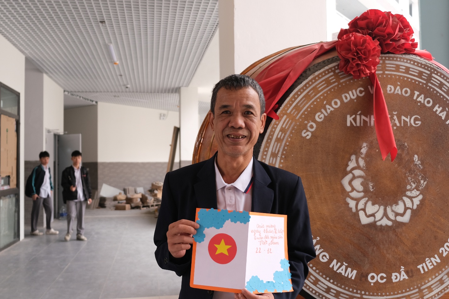 Nụ cười rạng rỡ của bác Lý Văn Thọ khi đón nhận tấm thiệp đáng yêu từ học sinh lớp 9A3.