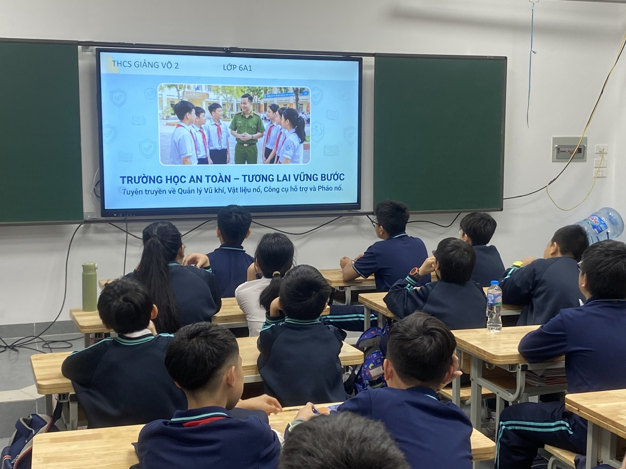 Thực hiện đề nghị của Công an phường Giảng Võ và sự chỉ đạo của Ban Giám hiệu nhà trường, nhằm nâng cao nhận thức, ý thức chấp hành pháp luật cho học sinh và chủ động phòng ngừa các nguy cơ mất an toàn liên quan đến vũ khí, vật liệu nổ và pháo nổ trong dịp Tết Nguyên đán sắp tới, sáng ngày 19/01/2026, trường THCS Giảng Võ 2 đã tổ chức hoạt động tuyên truyền về quản lí vũ khí, vật liệu nổ, công cụ hỗ trợ và phòng, chống pháo nổ trong giờ sinh hoạt đầu tuần, thời điểm bắt đầu học kì II năm học 2025–2026.