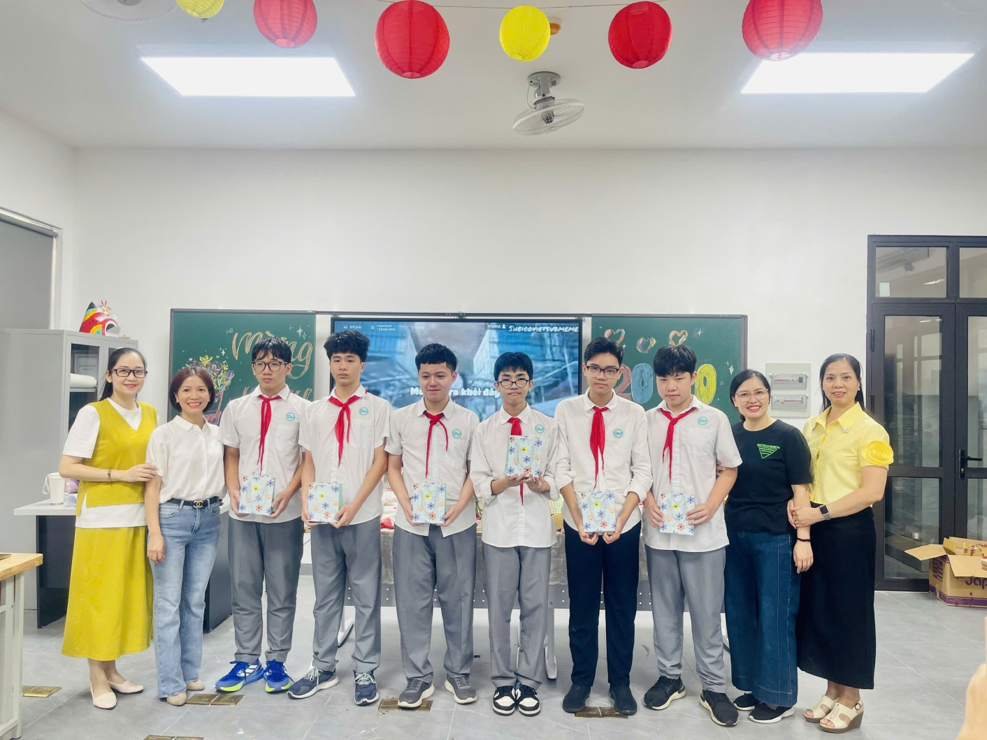 Mở đầu buổi sinh hoạt, bạn Khôi Nguyên – đại diện tập thể nam sinh 9A3 – đã thay mặt lớp gửi tặng món quà nhỏ và lời chúc tới cô giáo chủ nhiệm. Chiếc hộp quà được gói cẩn thận cùng tấm thiệp viết tay chứa đựng lời nhắn giản dị mà sâu sắc: “Chúc cô luôn xinh đẹp, hạnh phúc và mãi là ngọn đèn soi sáng 9A3.” Nụ cười hiền hậu của cô như lan tỏa ấm áp khắp căn phòng, khiến ai cũng thấy lòng mình nhẹ nhõm và rộn ràng.