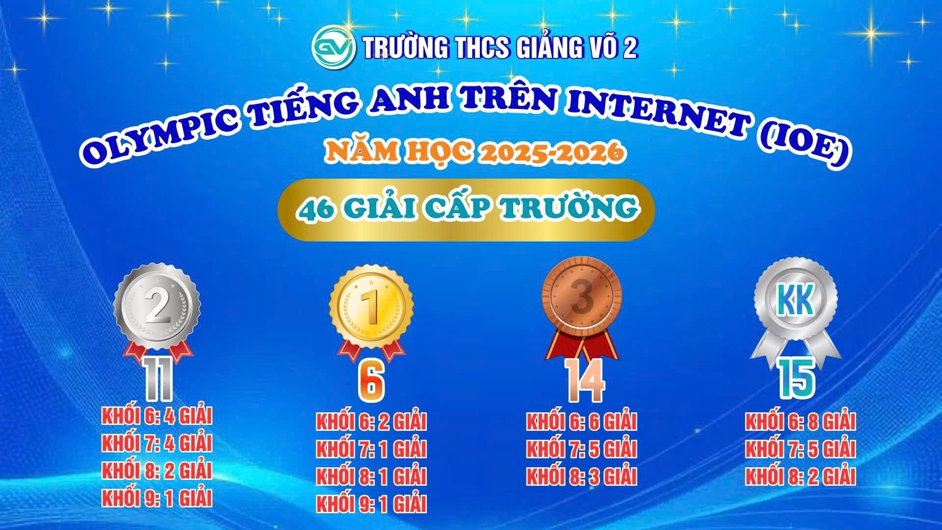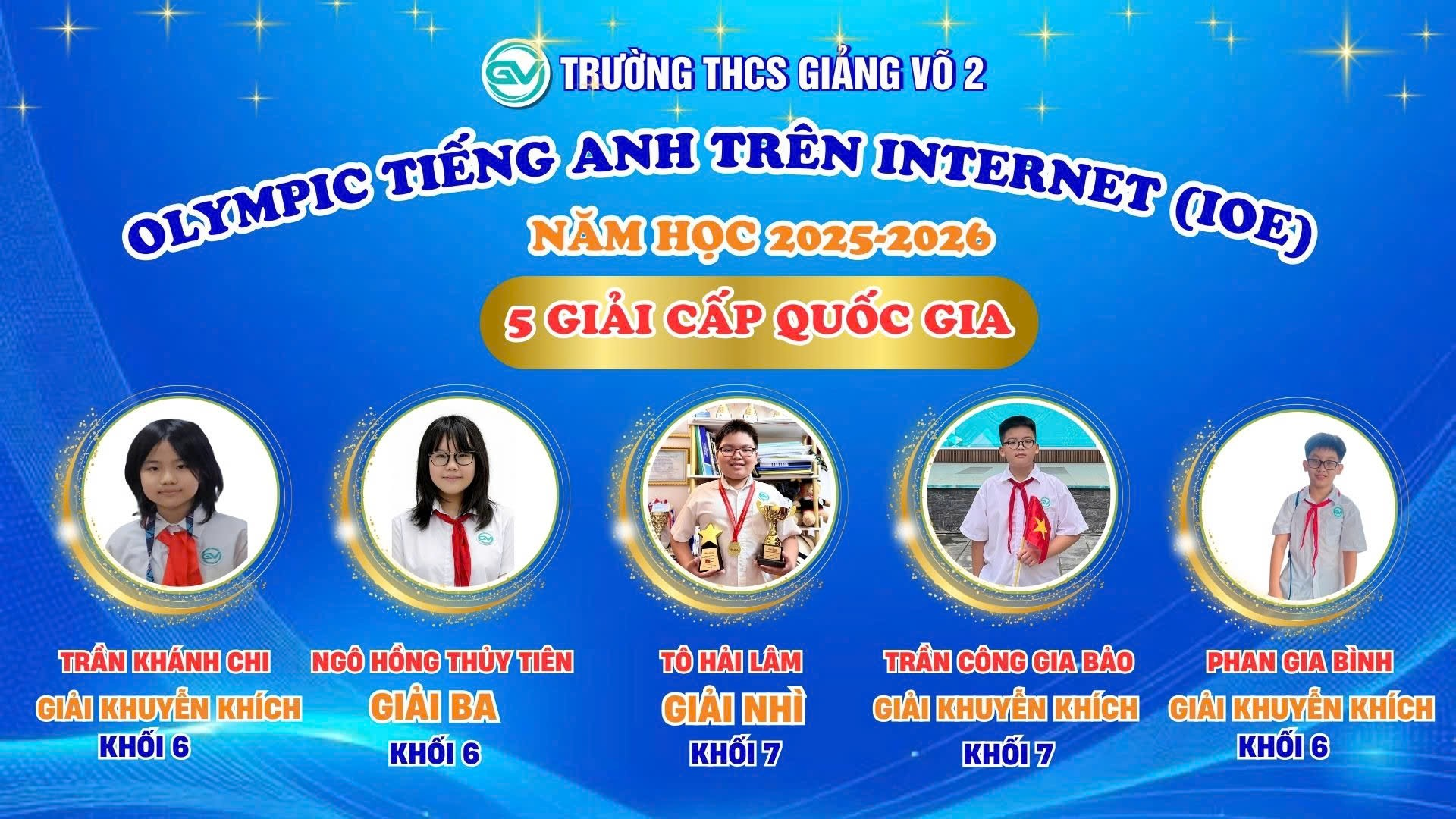 Đặc biệt, tại vòng thi IOE cấp Toàn quốc, học sinh trường THCS Giảng Võ 2 đã xuất sắc giành được 05 giải thưởng. Kết quả này không chỉ là niềm tự hào của học sinh và gia đình mà còn khẳng định chất lượng giáo dục Tiếng Anh của nhà trường trên phạm vi cả nước, góp phần nâng cao uy tín và vị thế của Giảng Võ 2 trong hệ thống giáo dục Thủ đô.