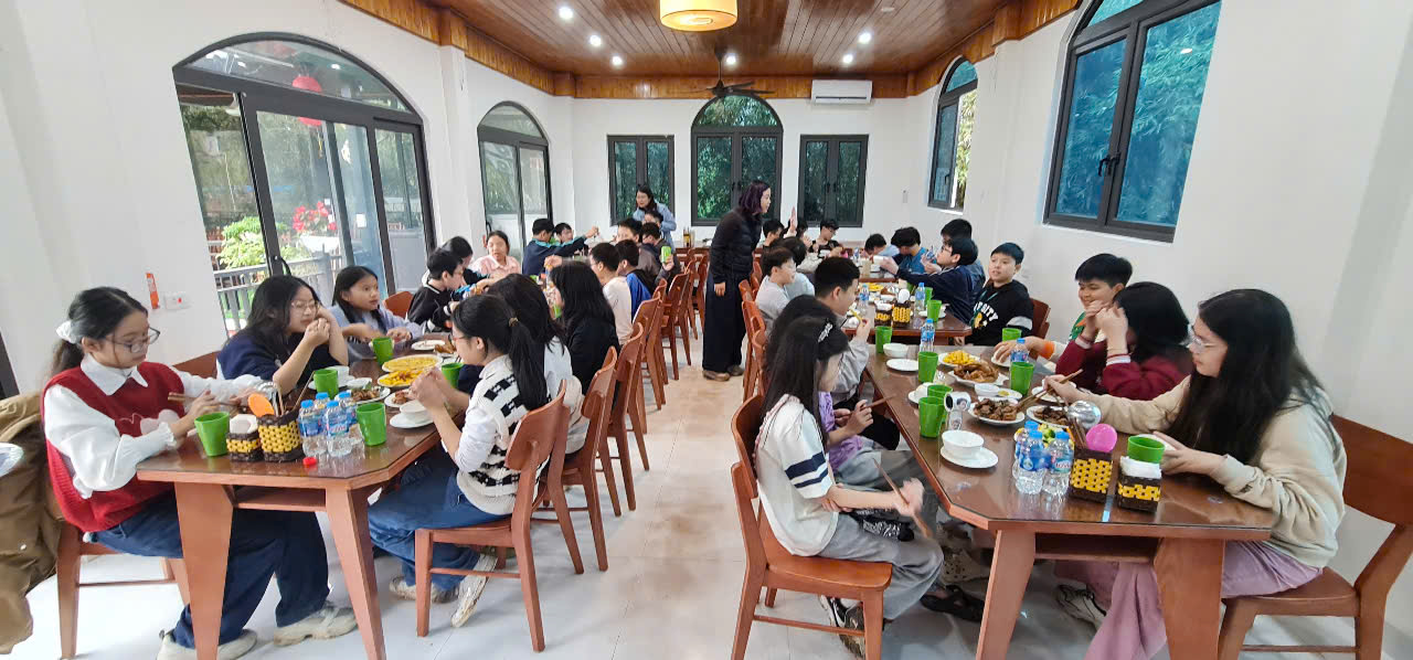 Ngay từ sáng sớm, hòa vào niềm vui háo hức, chuyến xe từ từ lăn bánh đưa các bạn 6A2 đến khu sinh thái Edu Home. Suốt hành trình, tiếng cười nói rộn ràng, sự mong chờ hiện rõ trên từng khuôn mặt. Khi xe dừng bánh, cả lớp vỡ òa trong niềm vui. Trước mắt là khung cảnh xanh mát của khu sinh thái với vườn cây trĩu quả, những luống chè xanh mướt, cùng nhiều khu vui chơi hấp dẫn.