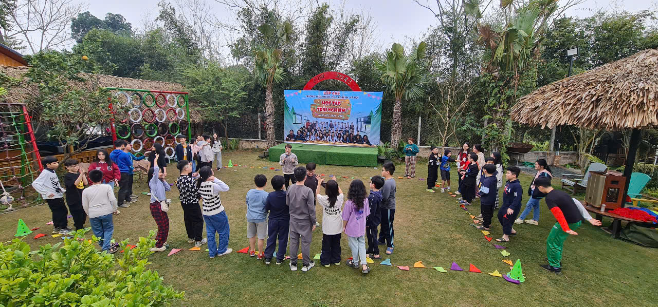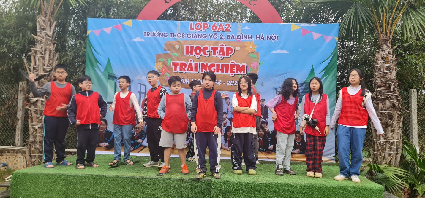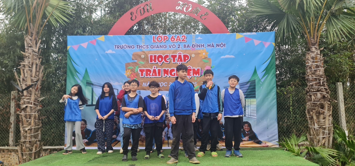 Đến buổi chiều, các bạn bước vào phần được mong đợi nhất: team building. Dù trời có mưa phùn nhưng không gì ngăn được tinh thần sôi nổi của 6A2. Dưới sự hướng dẫn hài hước của anh MC, cả lớp chia thành ba đội, mặc áo đồng phục khác màu nhưng chung một tinh thần đoàn kết. Các trò chơi thử thách như "Gia đình ba người", "Nhảy vào trong hay ra ngoài" khiến ai cũng cười vang. Những giây phút sát cánh bên nhau, cổ vũ đồng đội, vượt qua thử thách đã giúp các bạn hiểu hơn về tinh thần đồng đội và tình bạn gắn kết.