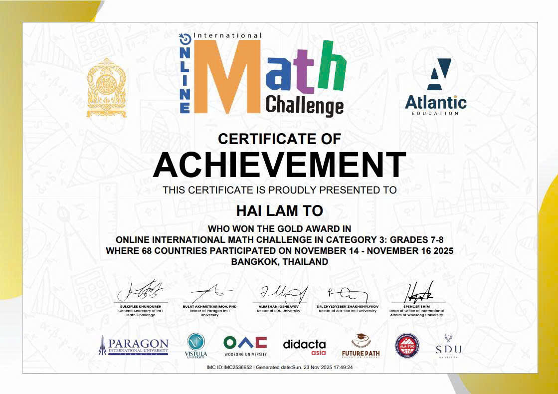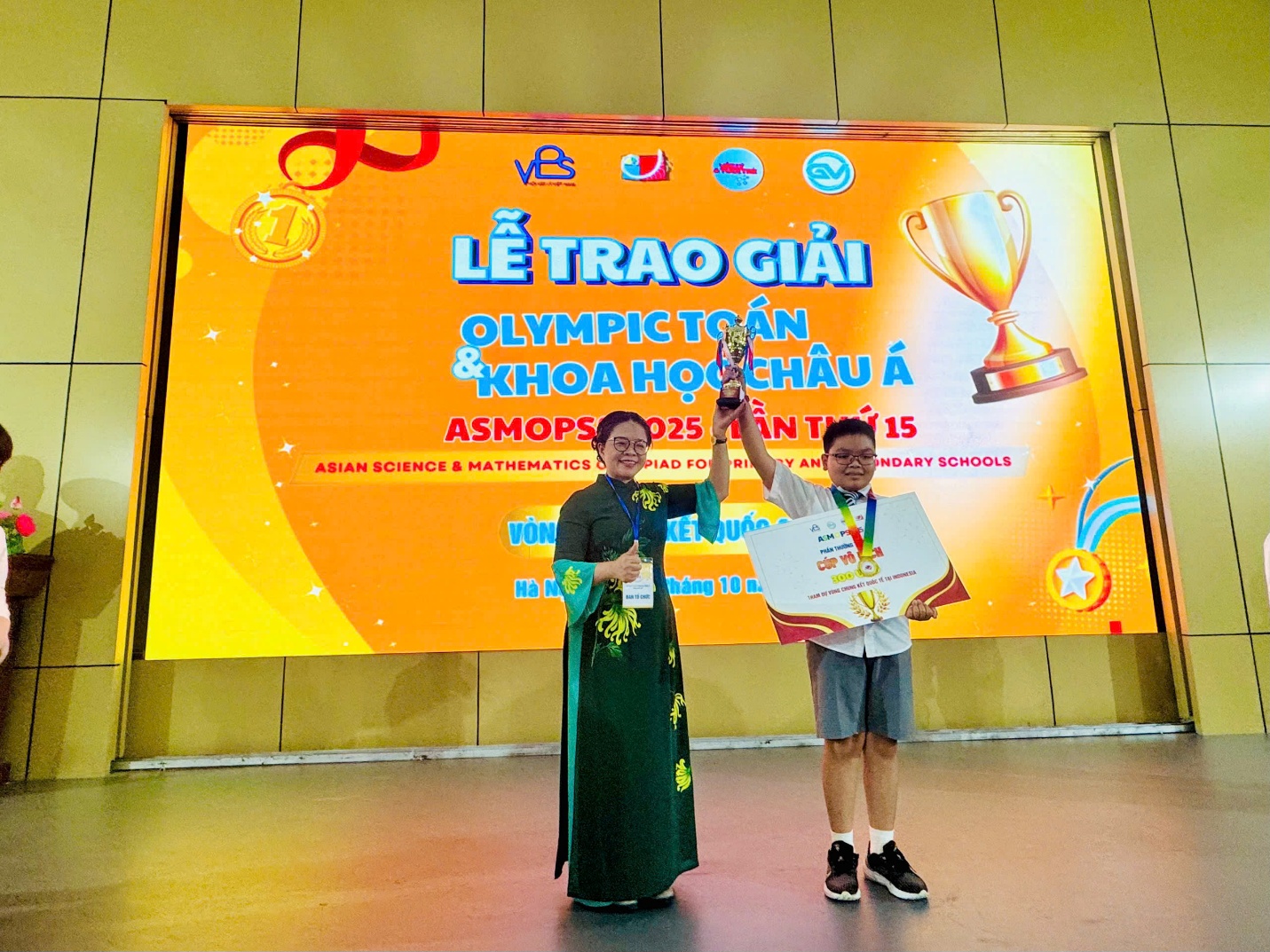 Trong kỳ thi năm nay, em Tô Hải Lâm đã xuất sắc giành Huy chương Vàng, lọt vào Top 3 thí sinh quốc tế và giữ vị trí Top 1 Việt Nam. Thành tích nổi bật giúp Hải Lâm nhận phần thưởng đặc biệt là một chiếc iPad. Trước đó, em cũng là Nhà vô địch kỳ thi ASMOPSS môn Toán, cho thấy sự ổn định và bứt phá trong năng lực toán học.