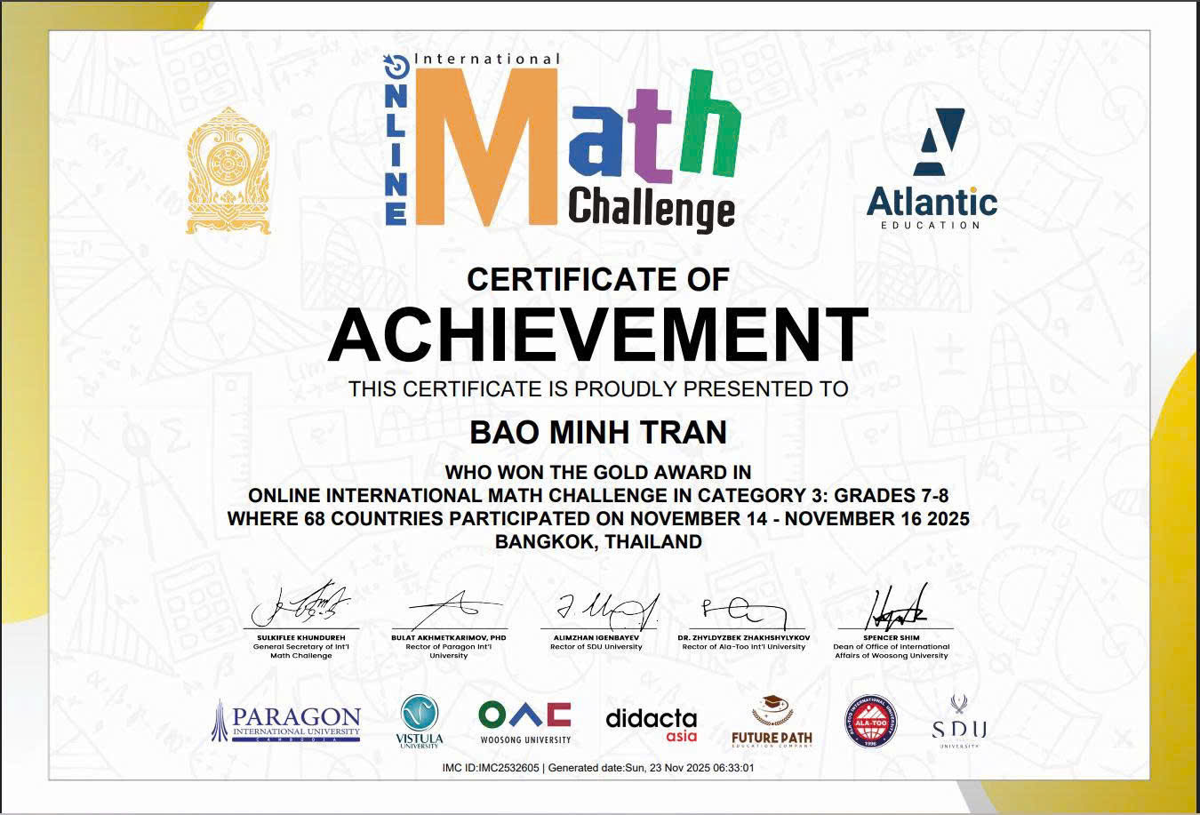 Em Trần Bảo Minh cũng đạt Huy chương Vàng IMC 2025. Không chỉ vậy, Bảo Minh còn giành Huy chương Vàng môn Toán và môn Khoa học tại kỳ thi NEO Science Olympiad, đồng thời trở thành Nhà vô địch môn Khoa học – minh chứng rõ nét cho tư duy khoa học đa dạng và tinh thần học tập nghiêm túc.