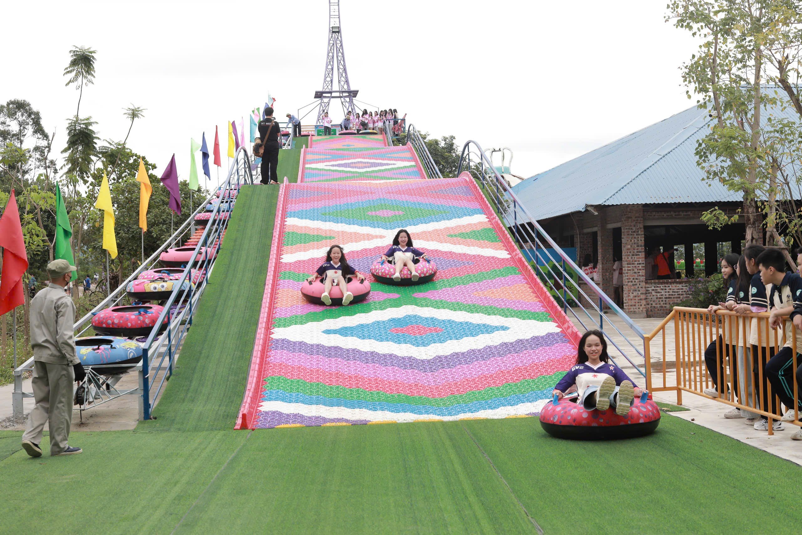 Trong chuyến tham quan, chúng tôi còn được trải nghiệm trò chơi trượt thảm cầu vồng đầy màu sắc. Cảm giác ngồi trên phao, lao vun vút xuống dốc khiến ai nấy đều hét vang vì thích thú. Tiếng cười giòn tan hòa cùng sắc màu rực rỡ đã tạo nên một kỷ niệm thật đáng nhớ.