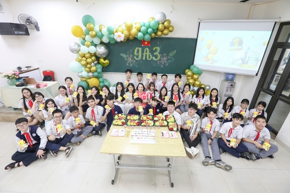 Cô Tâm cùng tập thể lớp 9A3 chào mừng sinh nhật của trường