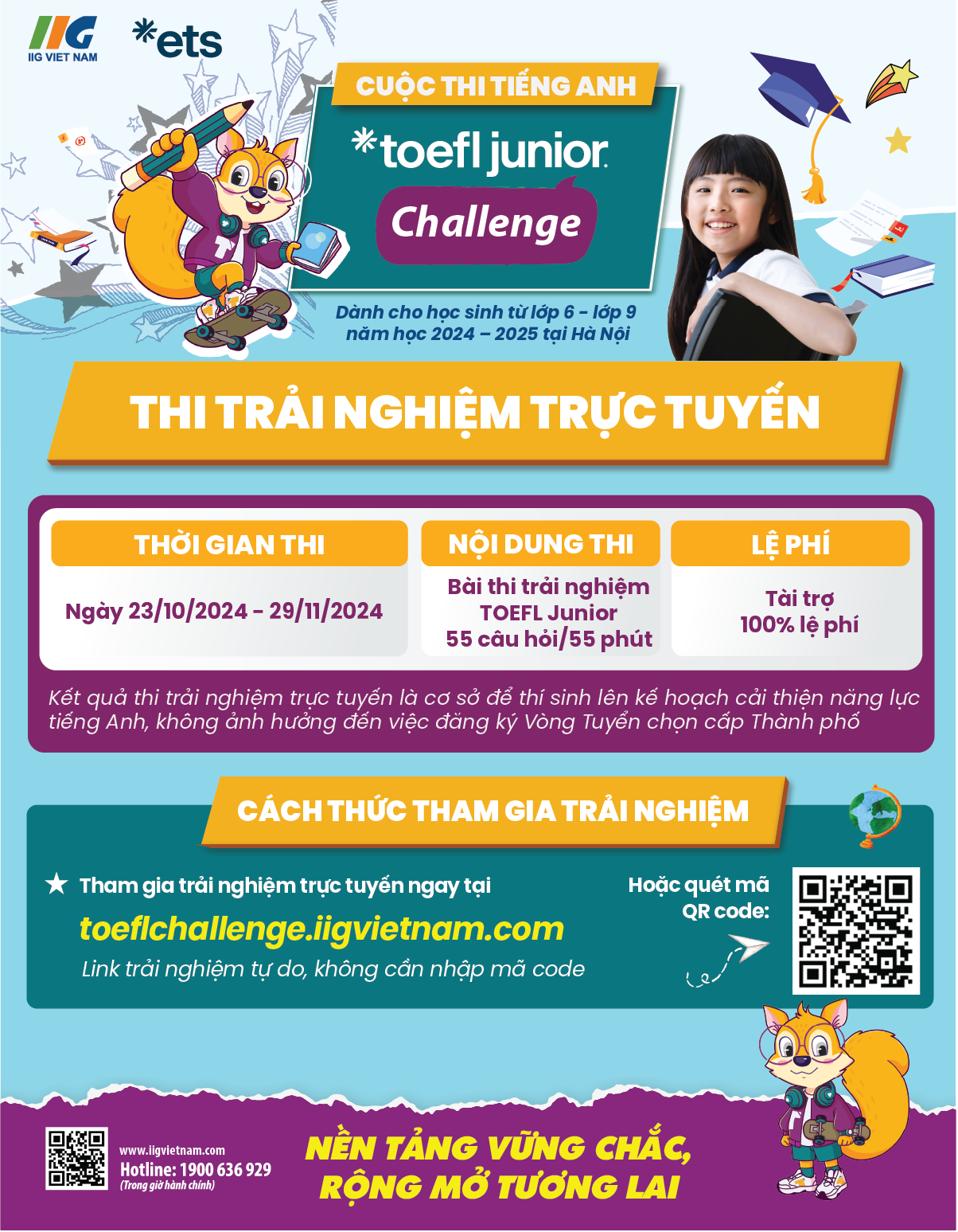 Trải nghiệm trực tuyến miễn phí: Học sinh được tiếp cận và thử sức với với bài thi trải nghiệm TOEFL Junior hoàn toàn miễn phí (từ ngày 23/10 đến 29/11/2024). Học sinh dễ dàng trải nghiệm mọi lúc mọi nơi tại link: https://toeflchallenge.iigvietnam.com