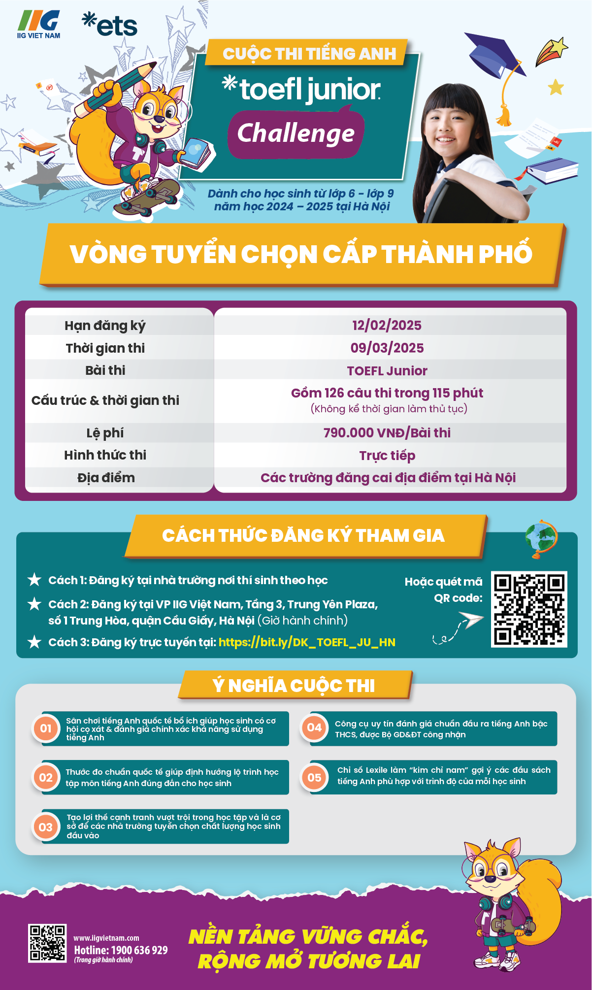 💥 Sân chơi tiếng Anh TOEFL Junior Challenge năm học 2024-2025 bổ ích, lý thú dành cho học sinh từ lớp 6 đến lớp 9 do Tổ chức Giáo dục IIG Việt Nam – Đại diện Quốc gia của Viện Khảo thí Giáo dục Hoa Kỳ (ETS) triển khai, chính thức phát động tại Hà Nội.