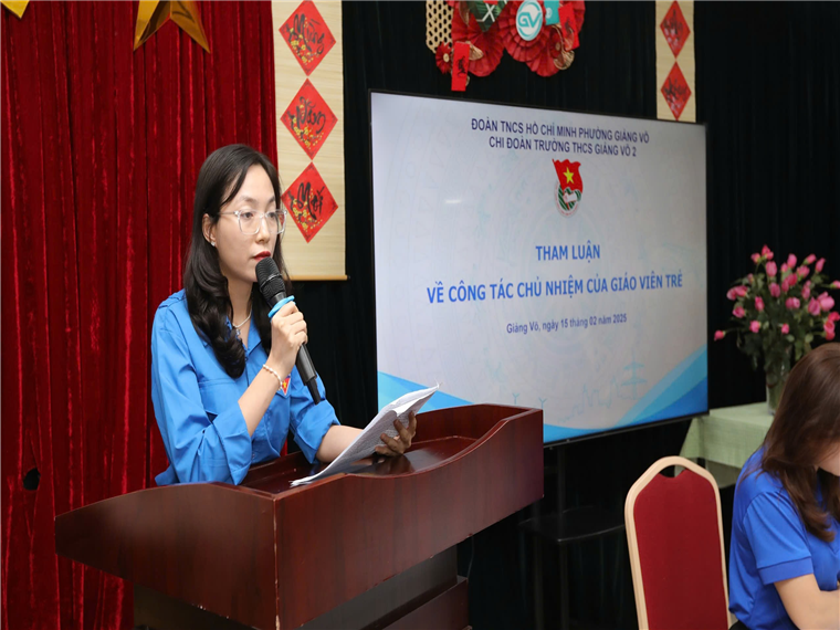 Đại hội còn được lắng nghe những bài tham luận tâm huyết từ các đoàn viên tiêu biểu. Cô giáo trẻ Bùi Thị Quỳnh Trang đã có bài tham luận đầy sâu sắc về công tác chủ nhiệm, nhấn mạnh tầm quan trọng của việc đồng hành cùng học sinh không chỉ trong học tập mà còn trong đời sống tinh thần. Cô Trang chia sẻ nhiều kinh nghiệm trong việc kết nối giữa giáo viên và phụ huynh, tạo động lực học tập cho học sinh và xây dựng môi trường lớp học thân thiện, tích cực. Cô Nguyễn Thị Huyền Tâm cũng đã mang đến bài tham luận sôi nổi về các hoạt động phong trào của giáo viên trẻ. Những ý tưởng đổi mới về tổ chức phong trào Đoàn – Đội trong thời gian tới đã nhận được sự đồng tình và đánh giá cao từ các đại biểu tham dự.