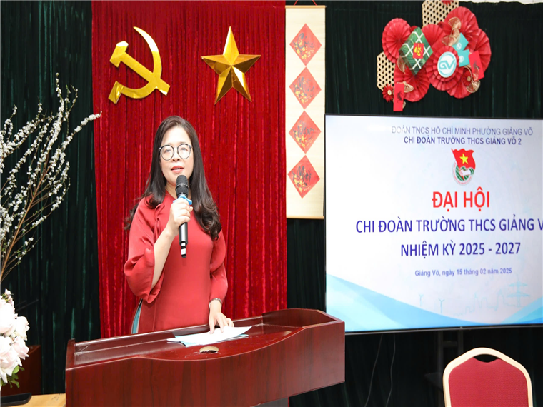Phát biểu chỉ đạo của tổ chức Đảng và Đoàn cấp trên, đồng chí Phạm Thị Hương Giang - Bí thư Chi bộ, Hiệu trưởng Trường THCS Giảng Võ 2 khẳng định vai trò của Chi đoàn giáo viên trong công tác giáo dục và phong trào thanh niên. Đồng chí nhấn mạnh tầm quan trọng của tinh thần đoàn kết, sáng tạo trong việc nâng cao chất lượng giảng dạy và bồi dưỡng thế hệ trẻ. Đồng thời, đồng chí cũng động viên các đoàn viên tiếp tục phát huy nhiệt huyết, đóng góp tích cực vào sự phát triển chung của nhà trường. Cũng tại đại hội, đồng chí Nguyễn Thị Hường - Bí thư Đoàn phường Giảng Võ đã có những chia sẻ sâu sắc về định hướng hoạt động của Chi đoàn trong thời gian tới. Đồng chí đánh giá cao tinh thần trách nhiệm của đoàn viên và cam kết Đoàn phường sẽ luôn đồng hành, hỗ trợ Chi đoàn giáo viên trong các hoạt động phong trào, giáo dục và công tác chuyên môn.