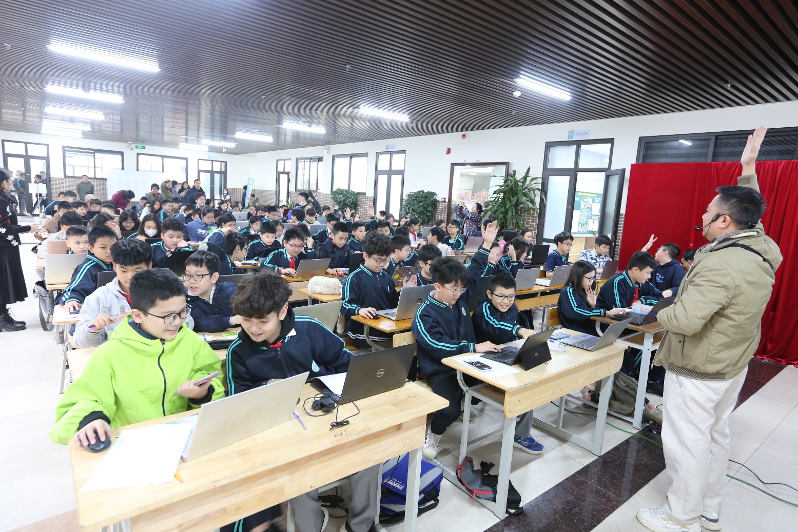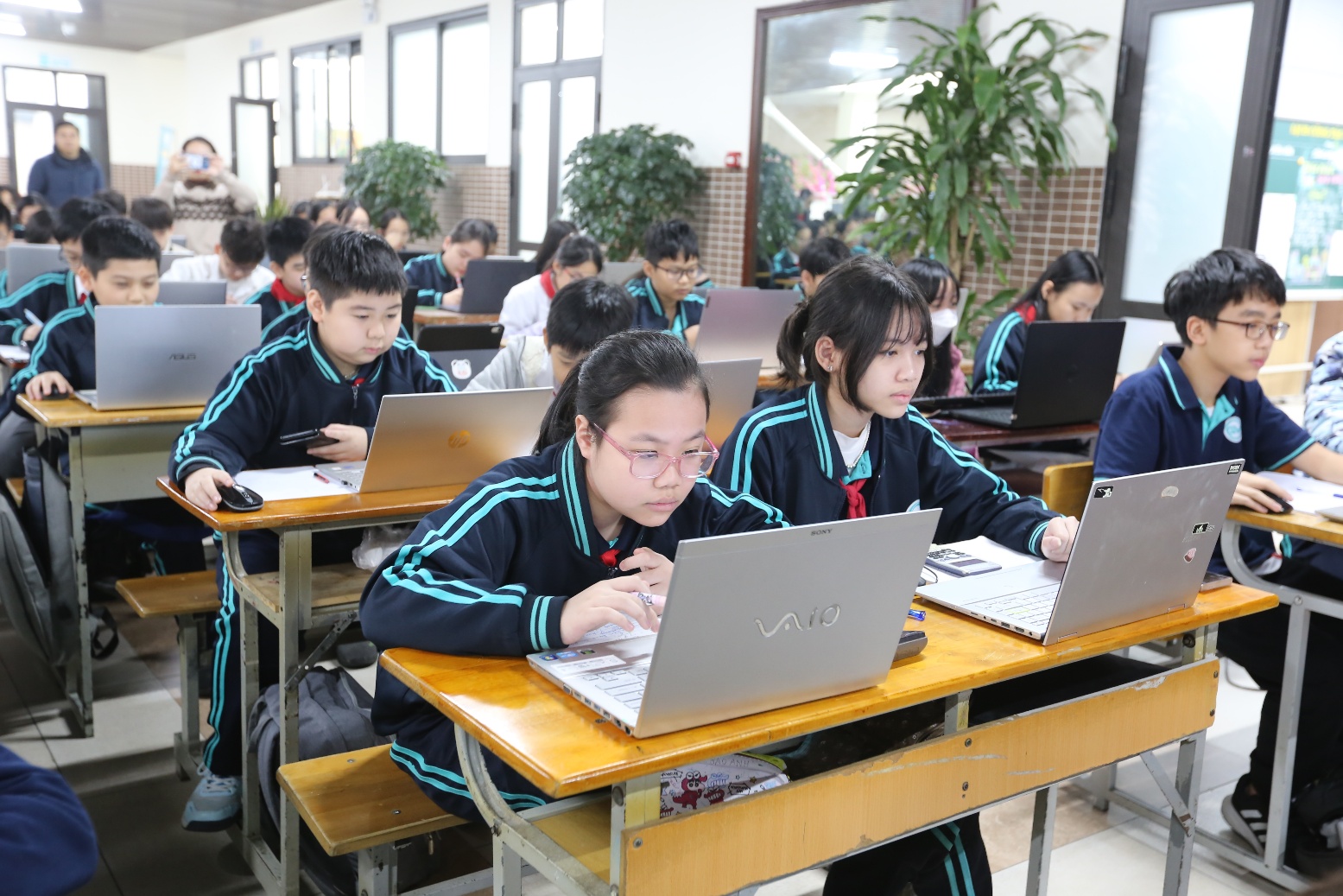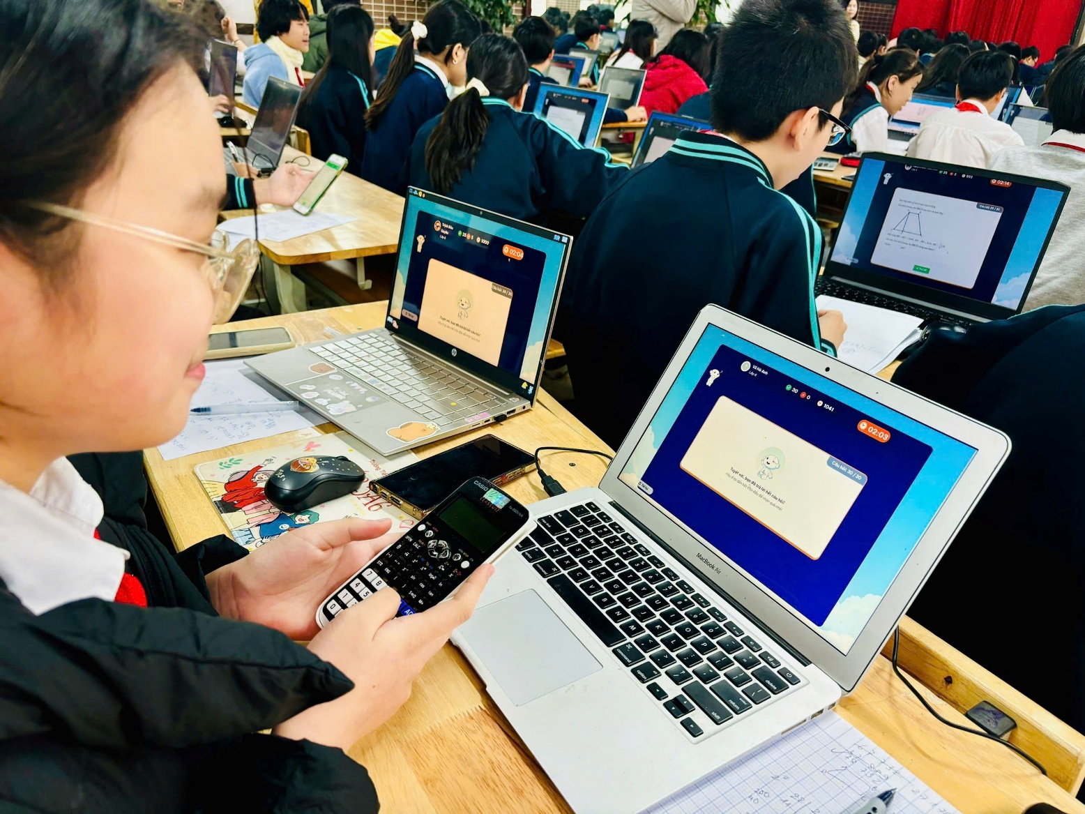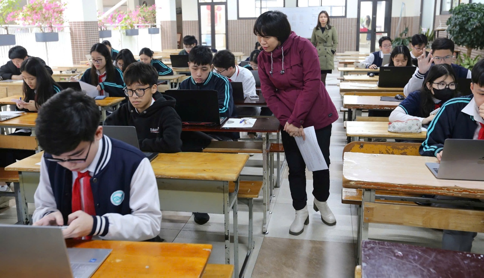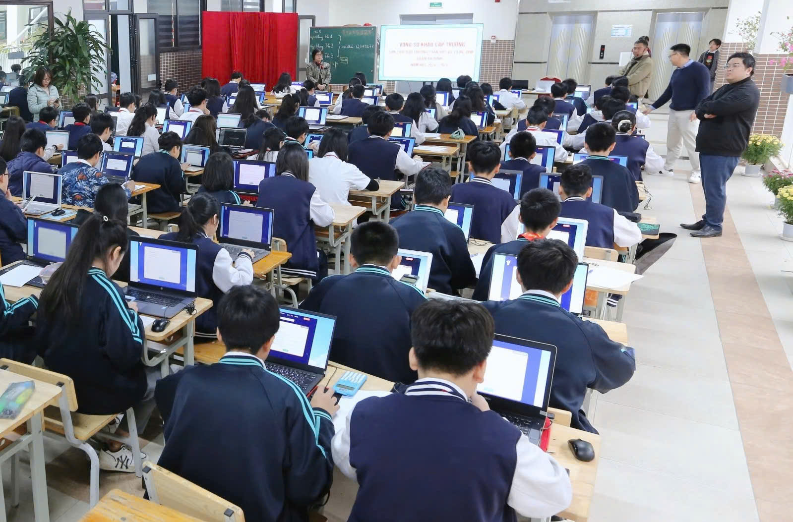 Các thí sinh nghiêm túc làm bài dưới sự giám sát chặt chẽ của ban tổ chức. Đồng thời, đội ngũ giáo viên và kỹ thuật viên túc trực sẵn sàng hỗ trợ học sinh khắc phục mọi sự cố, giúp buổi thi diễn ra thuận lợi.