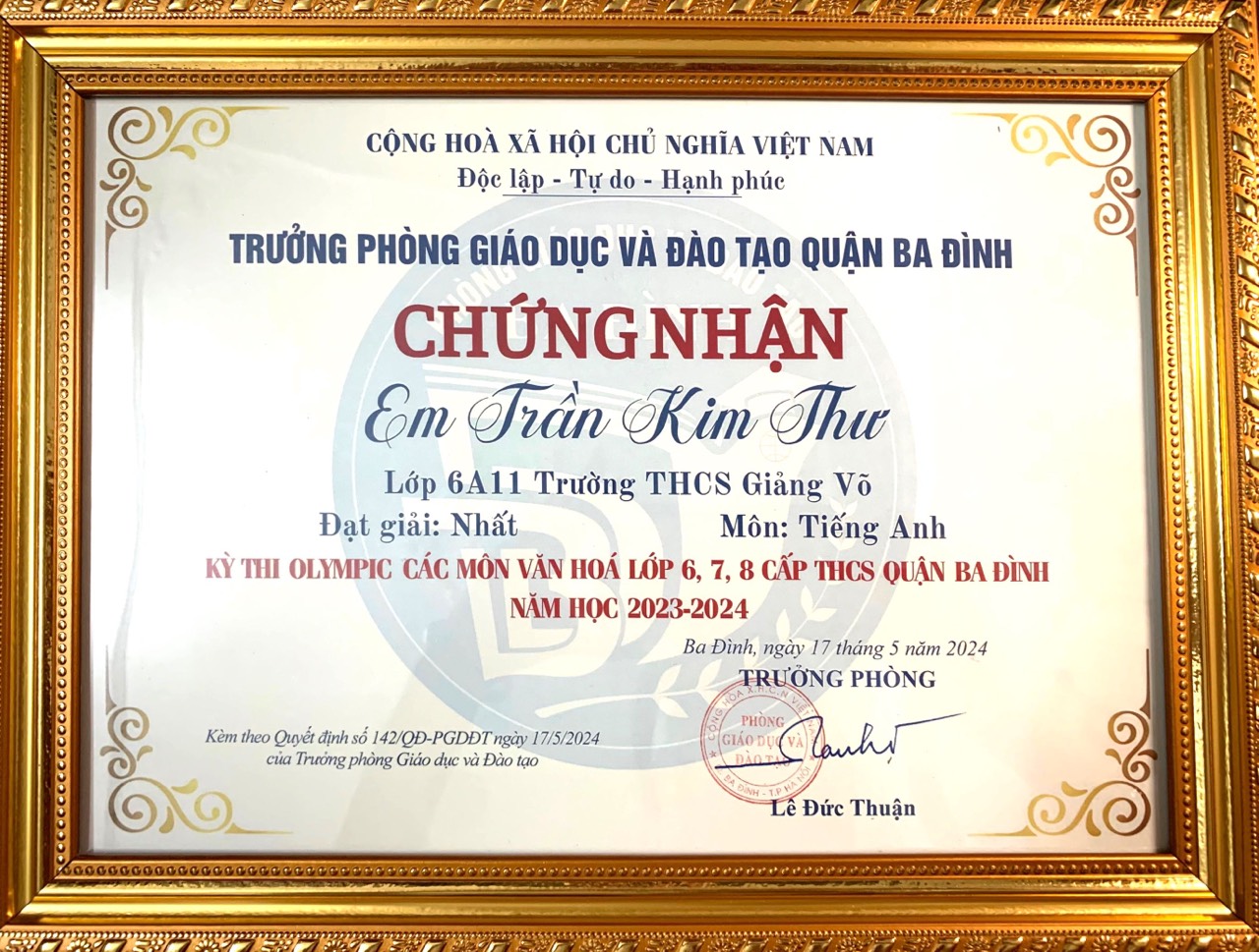 Vào tháng 05/2024, em còn đạt Giải Nhất môn Tiếng Anh Lớp 6 trong Kỳ thi Olympic các môn văn hoá lớp 6, 7, 8 cấp Quận do Phòng GD&ĐT Quận Ba Đình tổ chức.