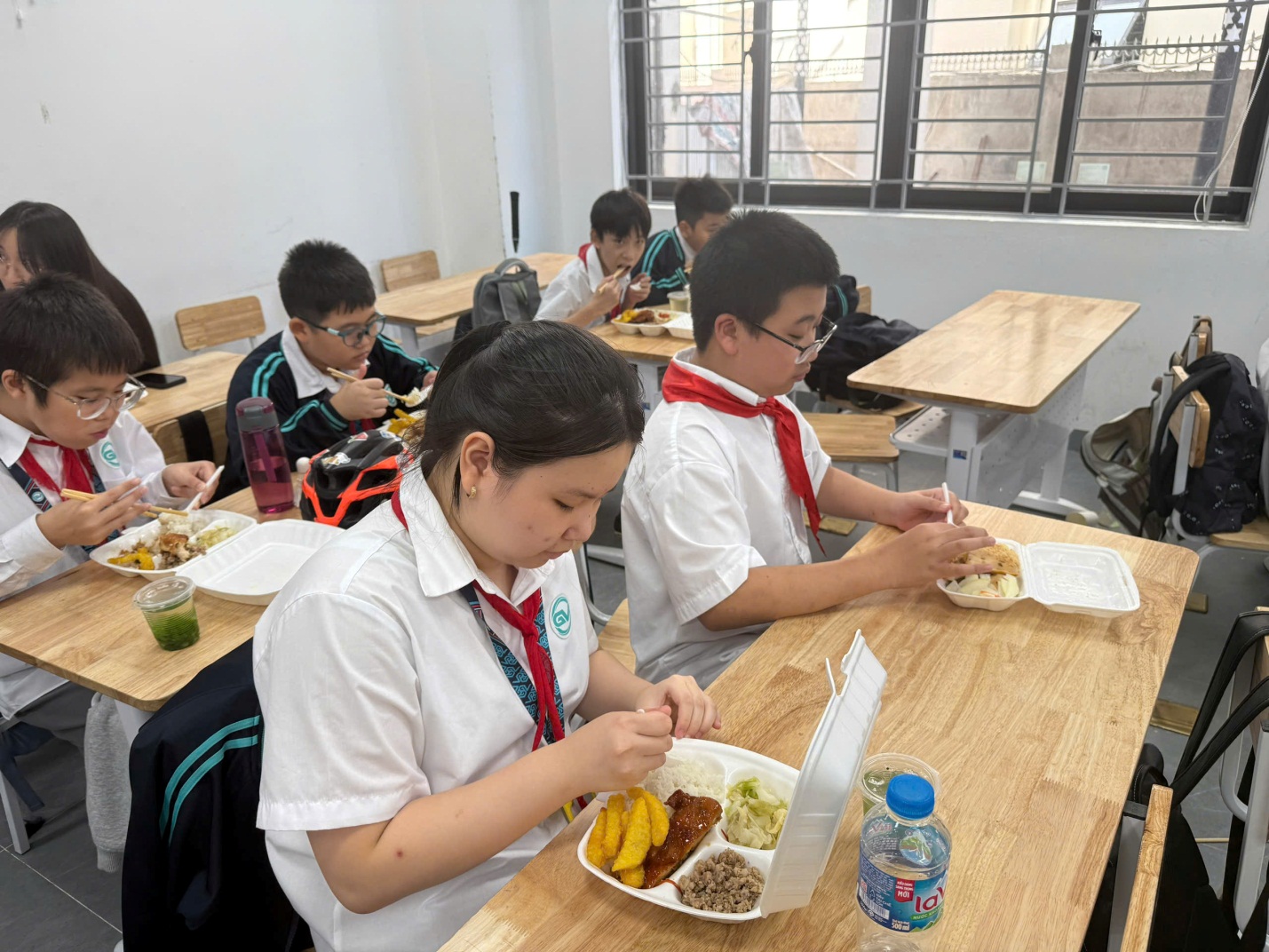Các bạn cùng nhau ăn trưa tại lớp sau những giờ tập luyện hăng say