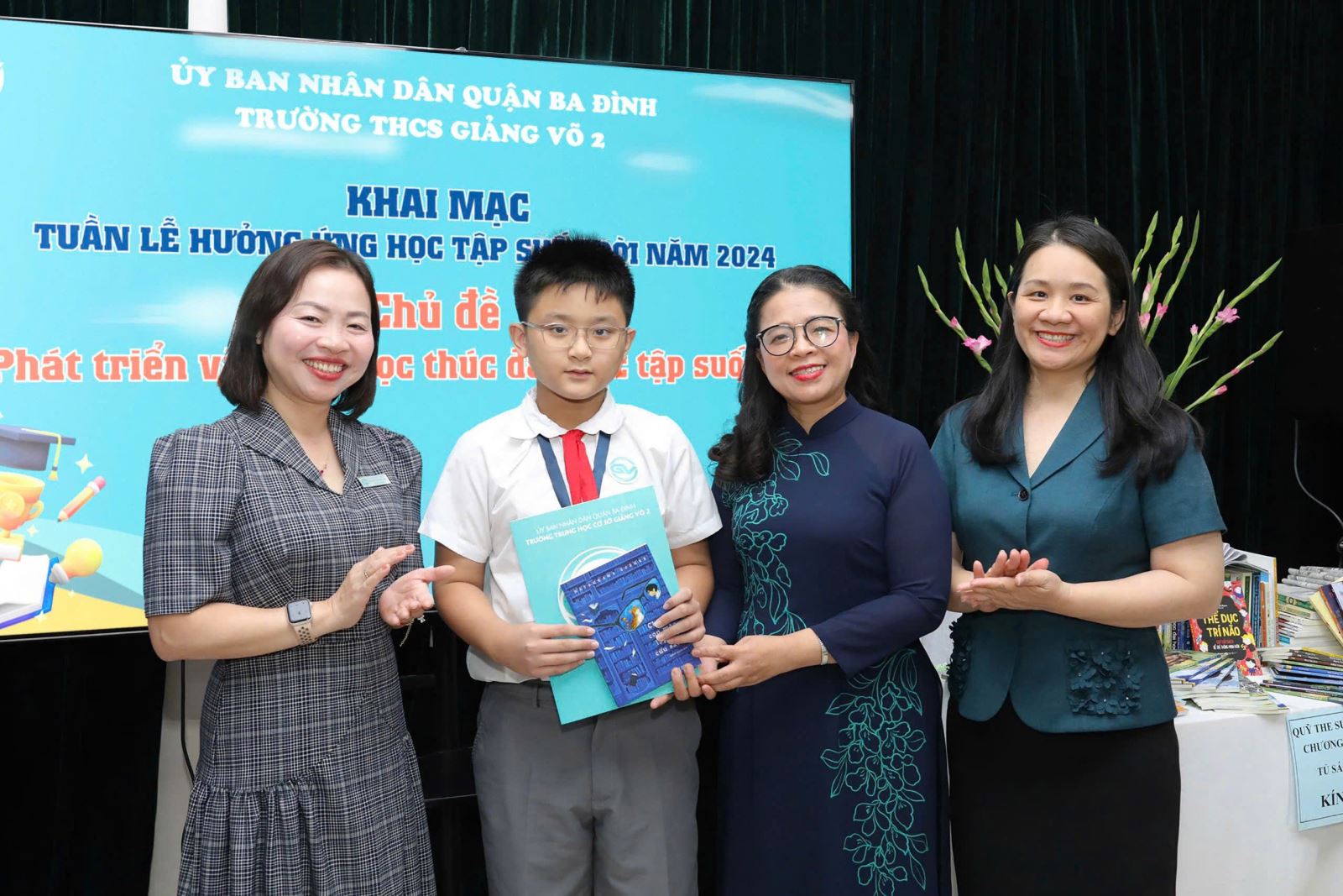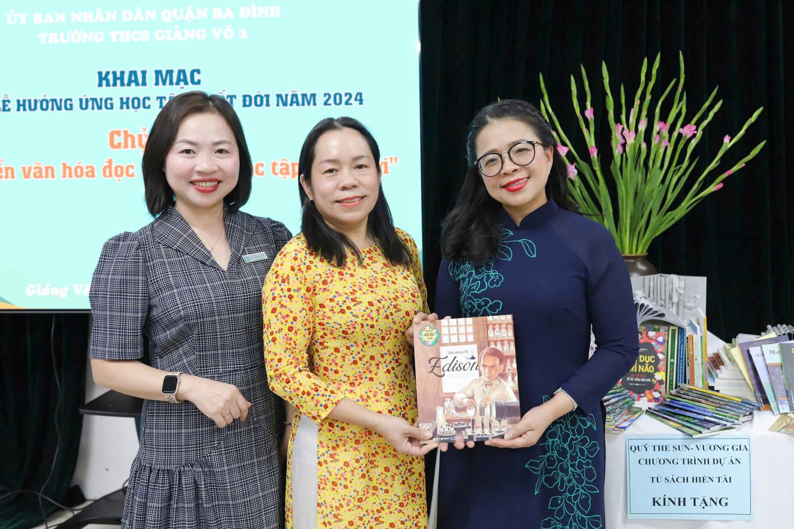 Đặc biệt, cô Bích Thủy, đại diện Quỹ The Sun - Vương gia, đã trao tặng 100 đầu sách quý cho Trường THCS Giảng Võ 2, góp phần xây dựng tủ sách tri thức và lan tỏa văn hóa đọc trong nhà trường.